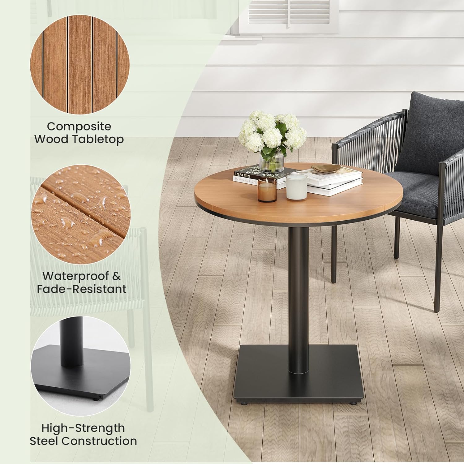 - [PLASTIC-WOOD TABLE]: This outdoor table is made from a unique wood-like tabletop and a heavy metal base for support. The plastic-wood table makes it more suitable for outdoor use, resistant to rust, dirt, and easy to care for.