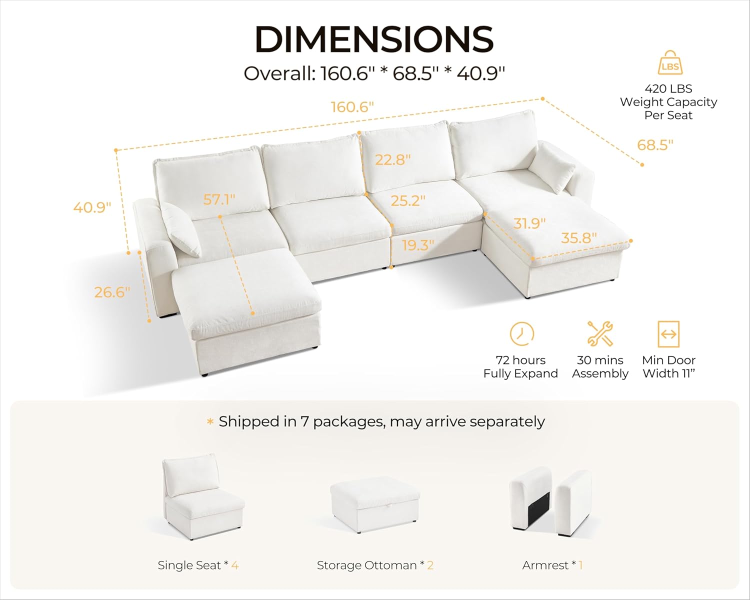 - 【Multiple Packages & Dedicated Support】 Your cloud modular sectional couch ships in 7 separate packages, which may arrive at different times. If you receive only some boxes, don’t worry—more are on the way! Need additional tracking details or assistance? We’re happy to help—just reach out! Our team is here to ensure you receive everything as expected and guarantee a smooth, hassle-free shopping experience with your complete satisfaction