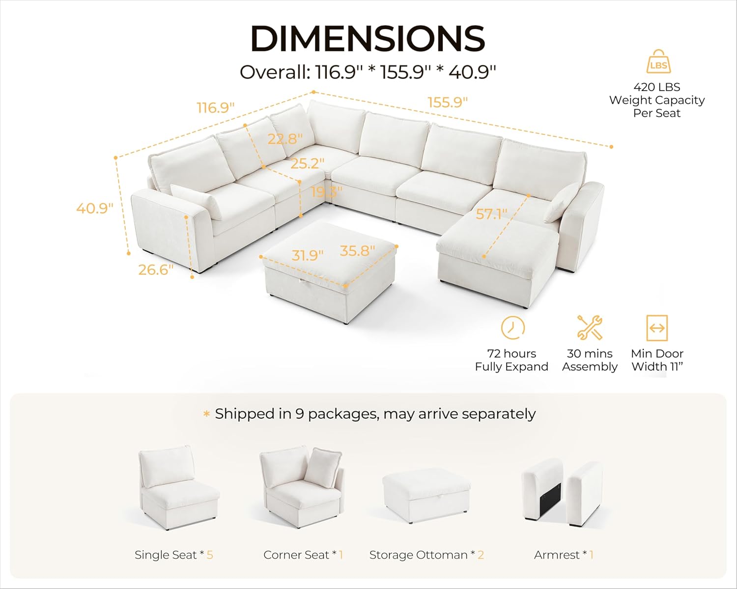 - 【Multiple Packages & Dedicated Support】 Your cloud modular sectional couch ships in 9 separate packages, which may arrive at different times. If you receive only some boxes, don’t worry—more are on the way! Need additional tracking details or assistance? We’re happy to help—just reach out! Our team is here to ensure you receive everything as expected and guarantee a smooth, hassle-free shopping experience with your complete satisfaction