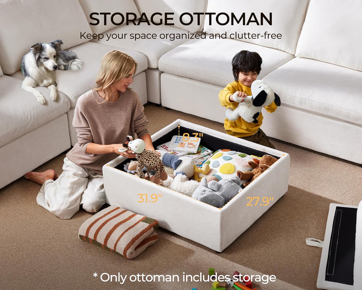 - 【Optional Hidden Storage for a Tidy Space】 Maintain a clutter-free home with the optional storage ottoman module, designed to keep blankets, pillows, or toys neatly tucked away. Convertible Couch with storage ensures essentials are always within reach yet out of sight, adding both function and style to your oversized fluffy modular sofa. Note: Storage is only available in configurations with the ottoman module