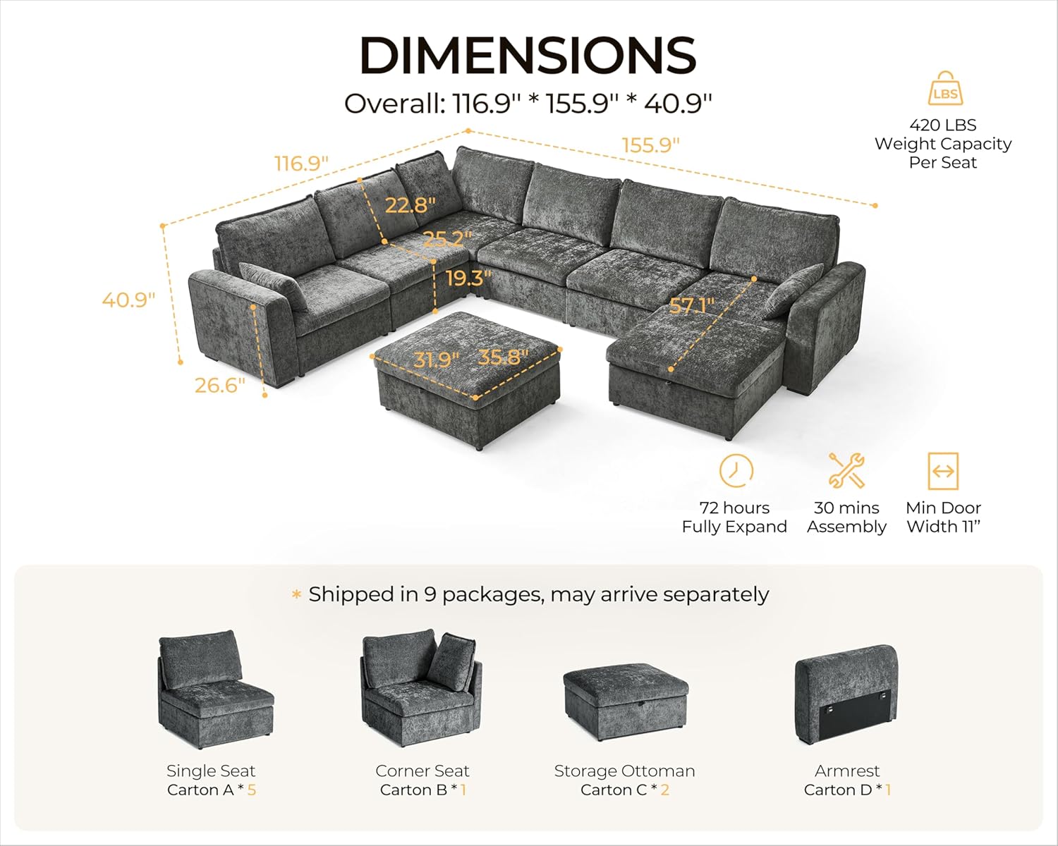 - 【Multiple Packages & Dedicated Support】 Your cloud modular sectional couch ships in 9 separate packages, which may arrive at different times. If you receive only some boxes, don’t worry—more are on the way! Need additional tracking details or assistance? We’re happy to help—just reach out! Our team is here to ensure you receive everything as expected and guarantee a smooth, hassle-free shopping experience with your complete satisfaction