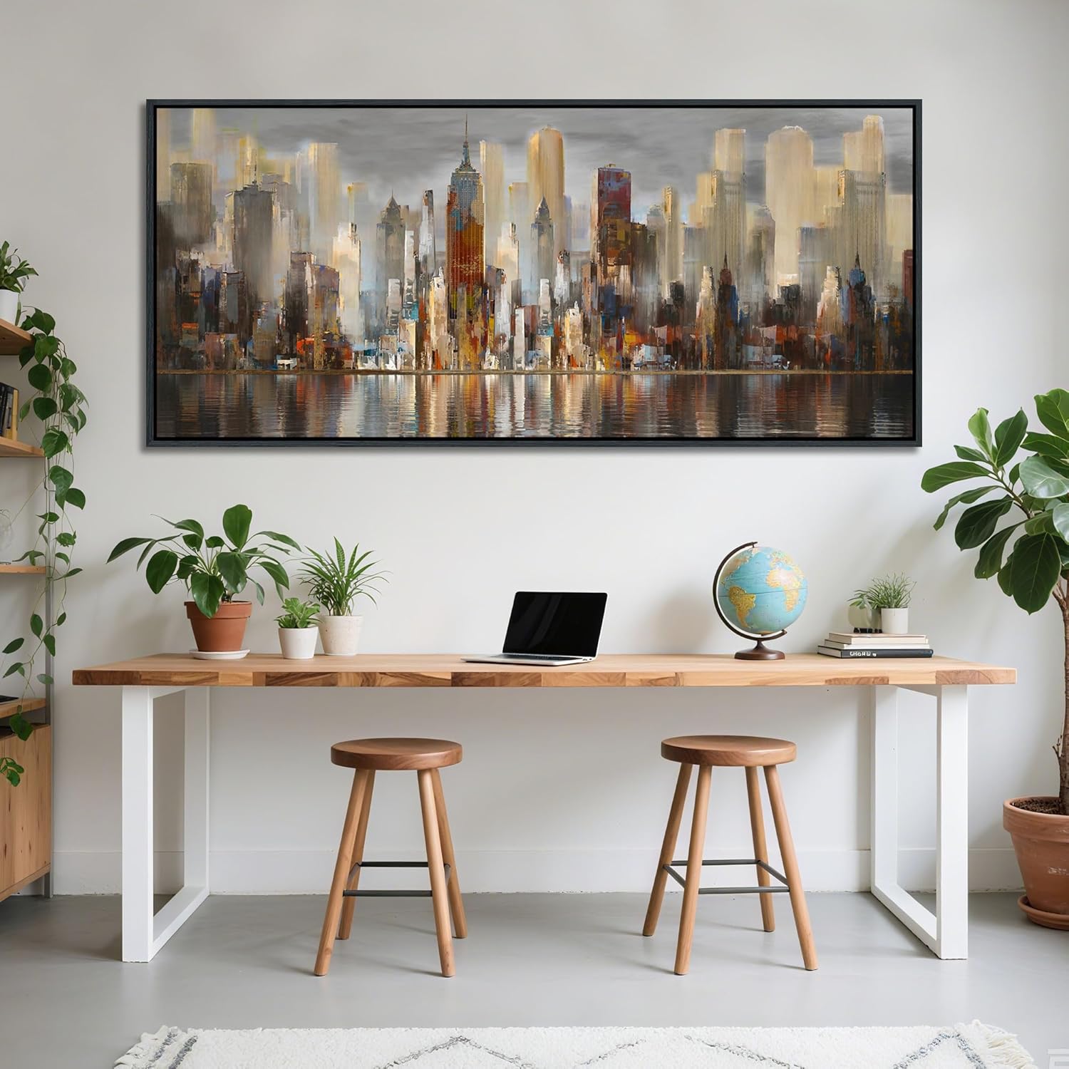 Framed Large Cityscape New York Wall Art Canvas Prints Abstract Brown City Theme Paintings Modern Canvas Wall Art for Living Room Pictures Wall Decor Bedroom Big Size 31x70