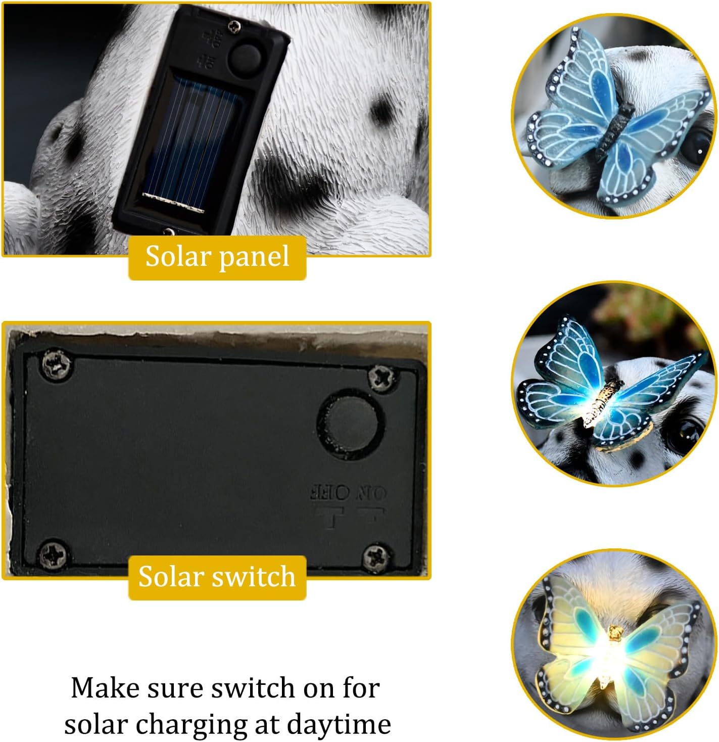 - ▶ Convenience - Dog solar light design will automatically charge and store energy during the daytime, only light up at night or in the dark automatically. You just push the OFF switch to ON for automatic activation at sundown.