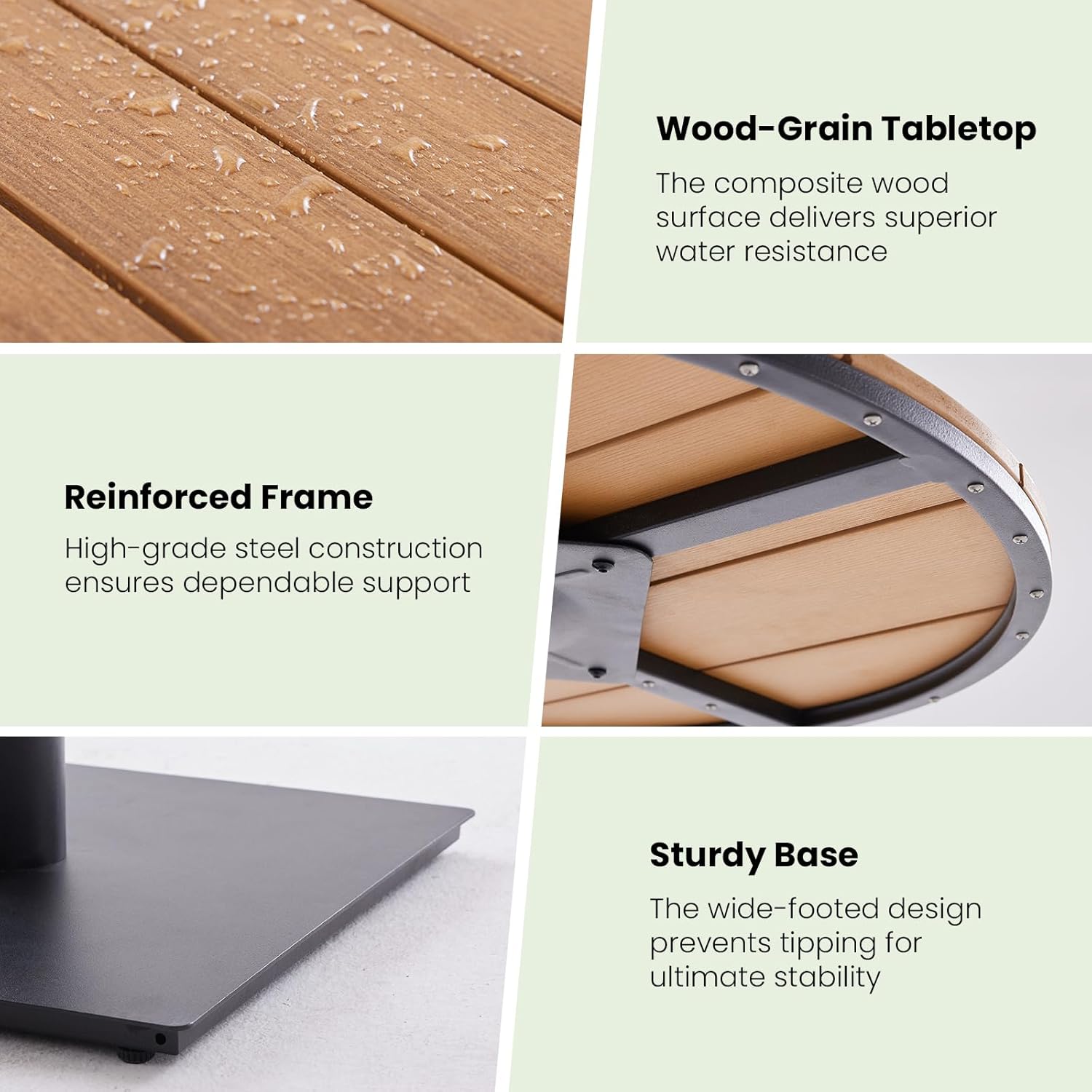 - [WOOD-LOOK OUTDOOR TABLETOP]: This outdoor table features a realistic wood-look surface, offering the timeless beauty of natural wood without the maintenance. Crafted from durable, weather-resistant materials, the table mimics the warmth and texture of wood while being highly resistant to the elements, including sun, rain, and humidity.