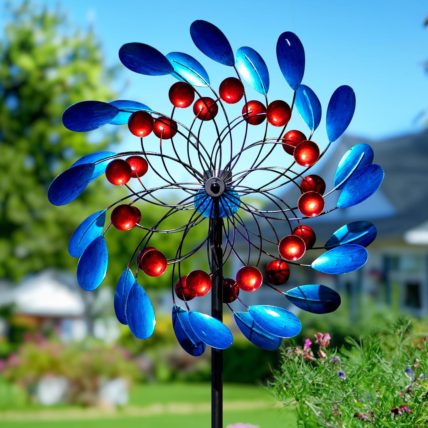 - Large Kinetic Spinner – Our windmill with a blade diameter of 24'', total height assembled 88'' from multiple sections of poles, you can adjust the height by removing the center pole. This wind sculptures stands out in any garden, yard, or patio, adding dynamic motion and dazzling light effects to your outdoor space.