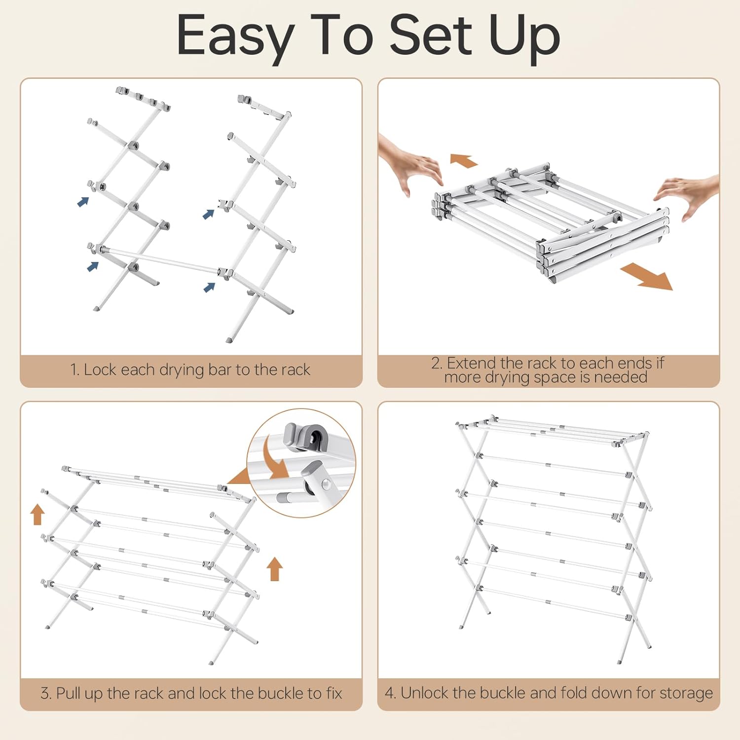 - Easy Assembly - The small laundry drying rack is super easy to put together. Just snap each bar into place and snap the end piece in on top tier for locking