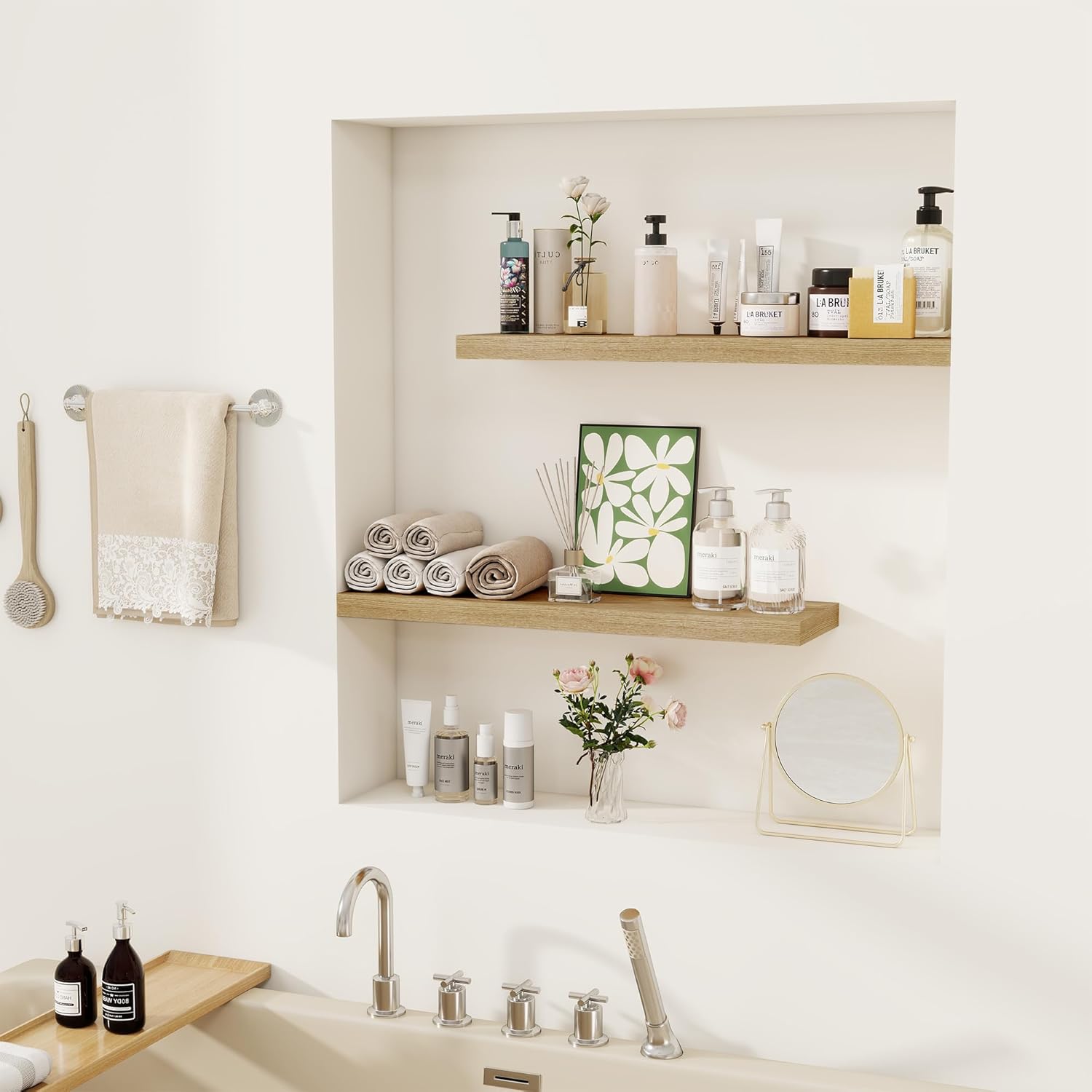 - STYLE & VERSATILITY: Elevate your home with our set of 2 elegant wall shelves, designed for versatile display options. Arrange them side by side for a clean, unified look, or stagger them for a bold, dynamic effect. Adding a touch of sophistication while providing practical storage