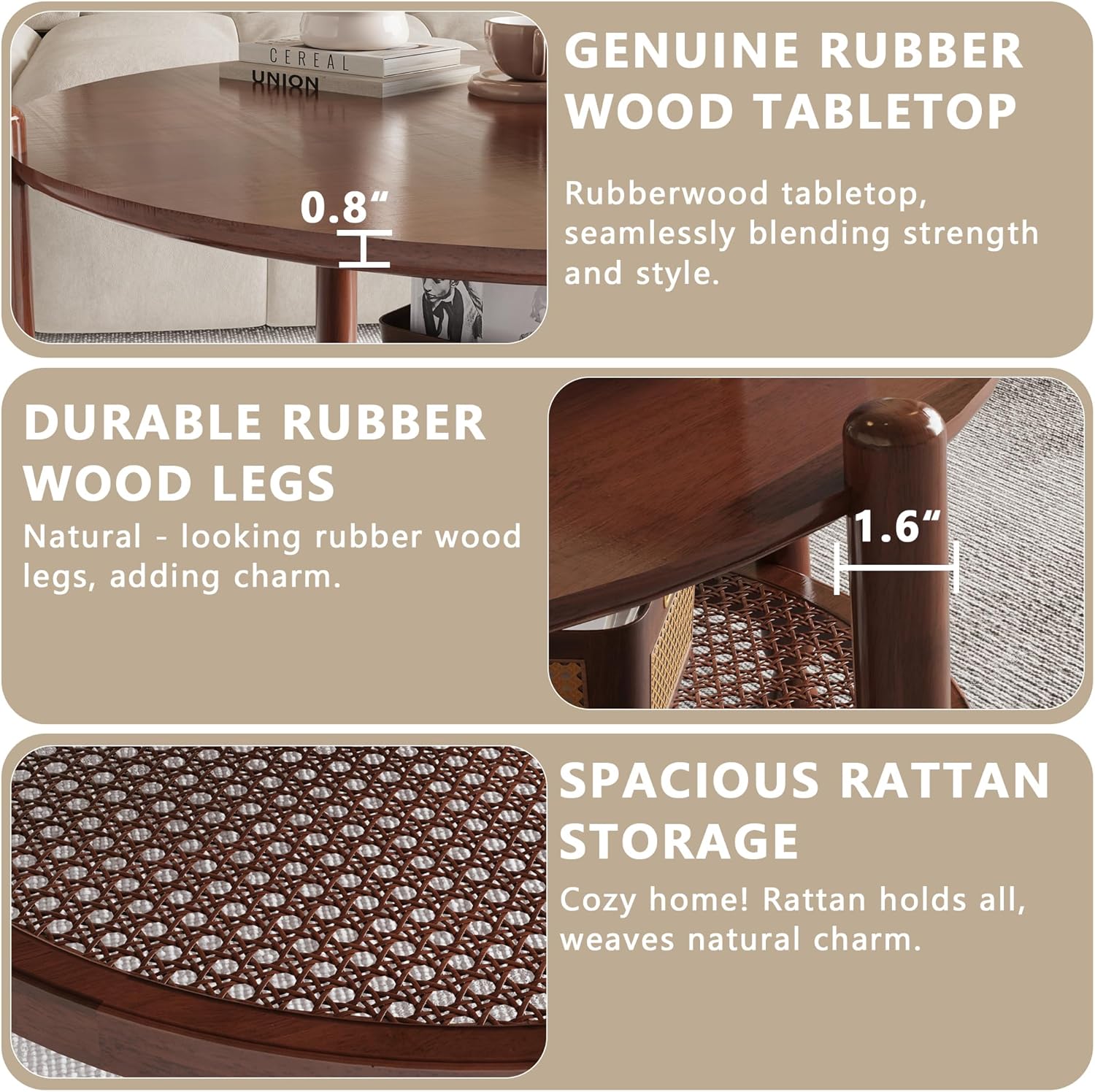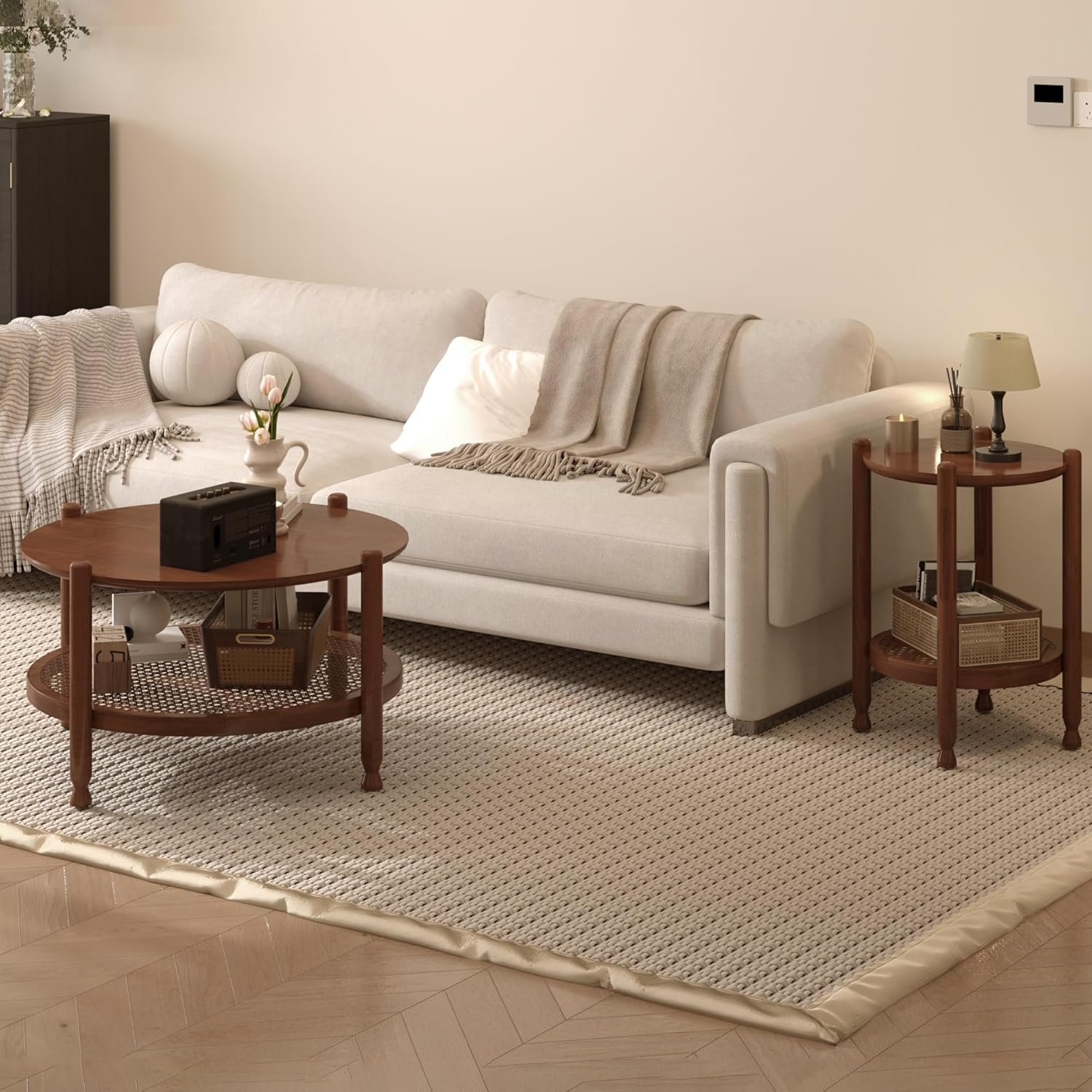 NSdirect Round End Table for Living Room, 2-Tier Rustic Wood Center Table for Home Decor with Boho Woven Rattan Storage Shelf | Modern Farmhouse Design, Easy Assembly, Red Brown