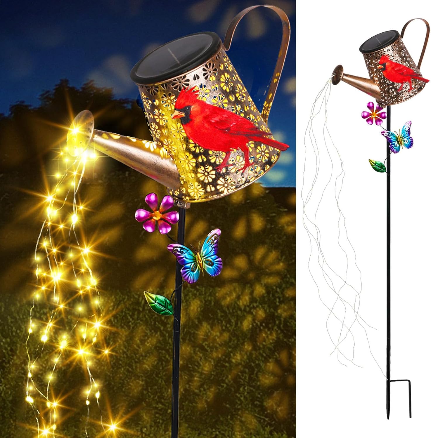 - Unique Garden Decor:This watering can with light features a charming and eye - catching design. The watering can shape, adorned with a vivid red cardinal and flowers, adds a touch of nature's beauty to any outdoor space.The garden decor comes with 6 strands of LED flashing string lights (60 LEDs), it can be easily bent and shaped into any shape you like, perfect for DIY.