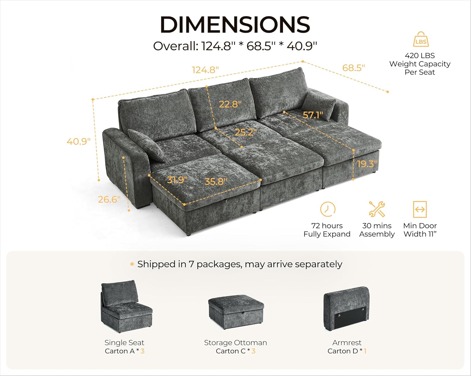 - 【Multiple Packages & Dedicated Support】 Your cloud modular sectional couch ships in 7 separate packages, which may arrive at different times. If you receive only some boxes, don’t worry—more are on the way! Need additional tracking details or assistance? We’re happy to help—just reach out! Our team is here to ensure you receive everything as expected and guarantee a smooth, hassle-free shopping experience with your complete satisfaction