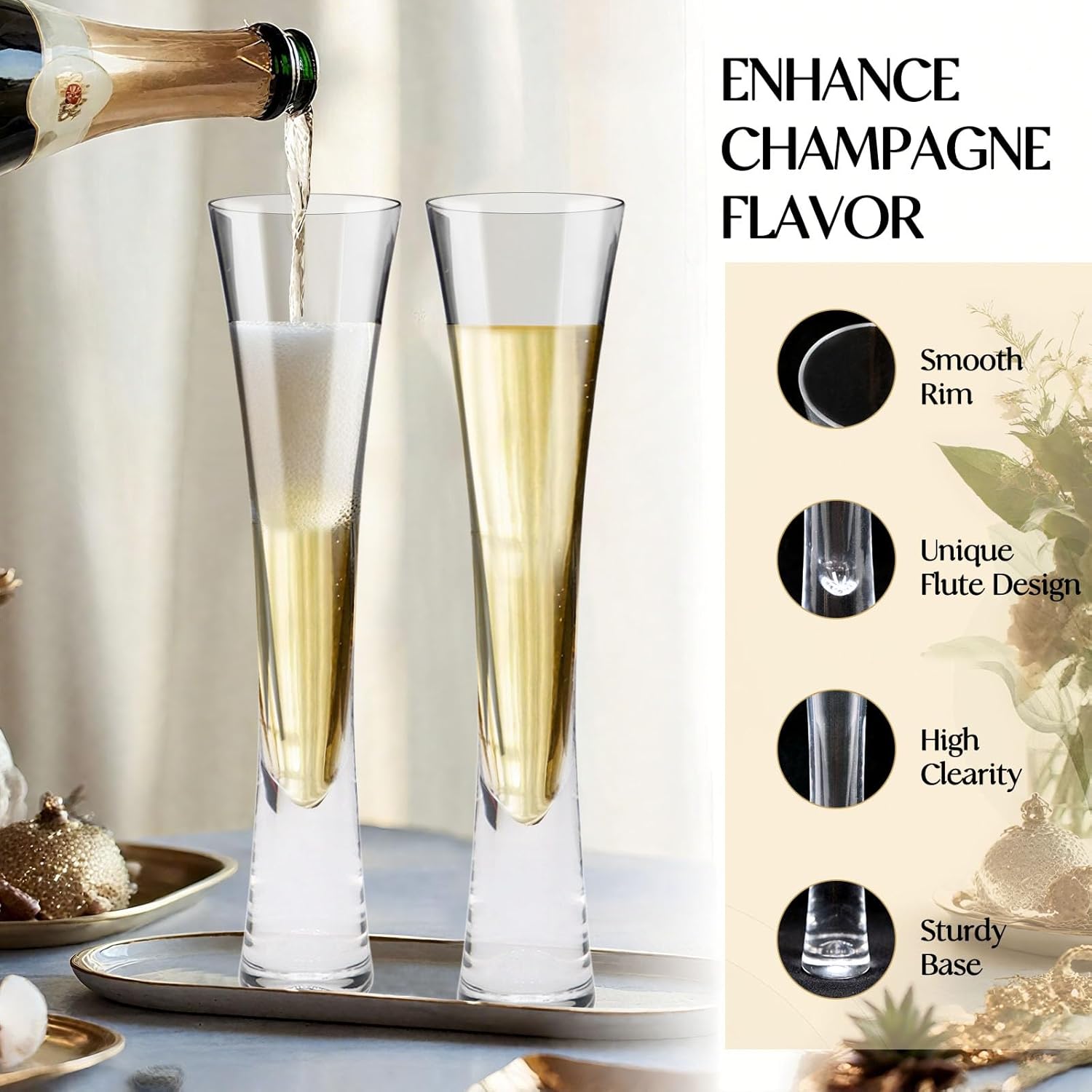 - 【Modern & Exquisite Toasting Fluts】Yaschmo champagne flutes feature a sleek, elongated silhouette that captures the essence of contemporary artistry. Designed with a refined small 5oz capacity, these glasses expertly channel bubbles from the base to the brim,intensifying aromas and enhancing the champagne’s effervescence. Whether you’re tasting vintage champagne, crisp Prosecco, or sparkling wine, the flutes’ graceful form and durable construction deliver a luxurious tasting experience.