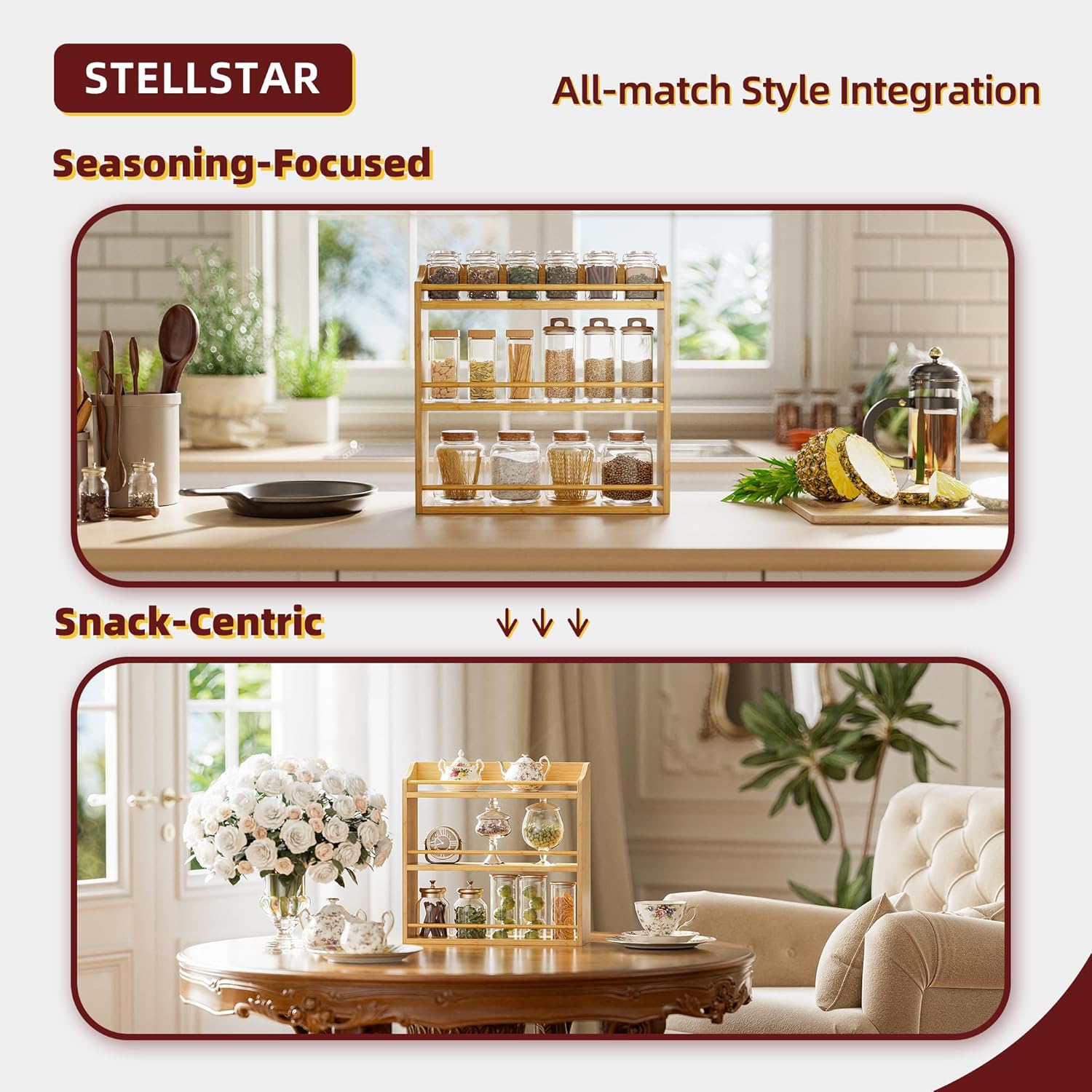 - SIMPLE, ELEGANT & VERSATILE: This rack is both a stunner and a workhorse. Its minimalist design oozes elegance, blending seamlessly with any decor to add warmth. But it’s more than a spice rack! Use it to organize your coffee bar, declutter your bathroom, or neatly stack snacks in mason jars. Wherever you place it—kitchen, pantry, bathroom—it transforms chaos into a tidy, stylish space