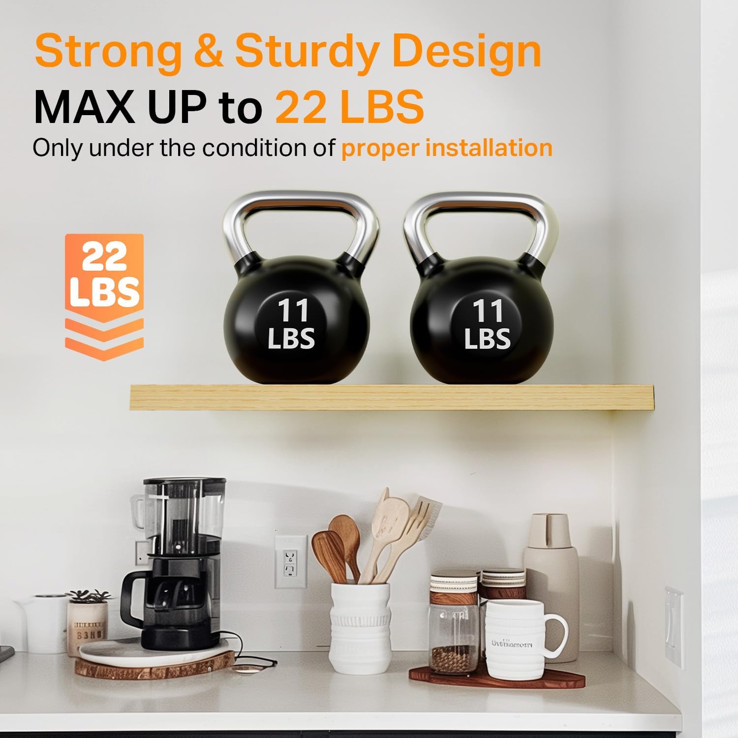 - 𝐒𝐭𝐫𝐨𝐧𝐠 𝐋𝐨𝐚𝐝 𝐂𝐚𝐩𝐚𝐜𝐢𝐭𝐲 – Made from 𝐝𝐮𝐫𝐚𝐛𝐥𝐞 𝐞𝐧𝐠𝐢𝐧𝐞𝐞𝐫𝐞𝐝 𝐰𝐨𝐨𝐝 and reinforced with sturdy brackets, each shelf 𝐬𝐮𝐩𝐩𝐨𝐫𝐭𝐬 𝐮𝐩 𝐭𝐨 𝟐𝟐 𝐥𝐛𝐬, making them ideal for books, plants, toiletries, or decor