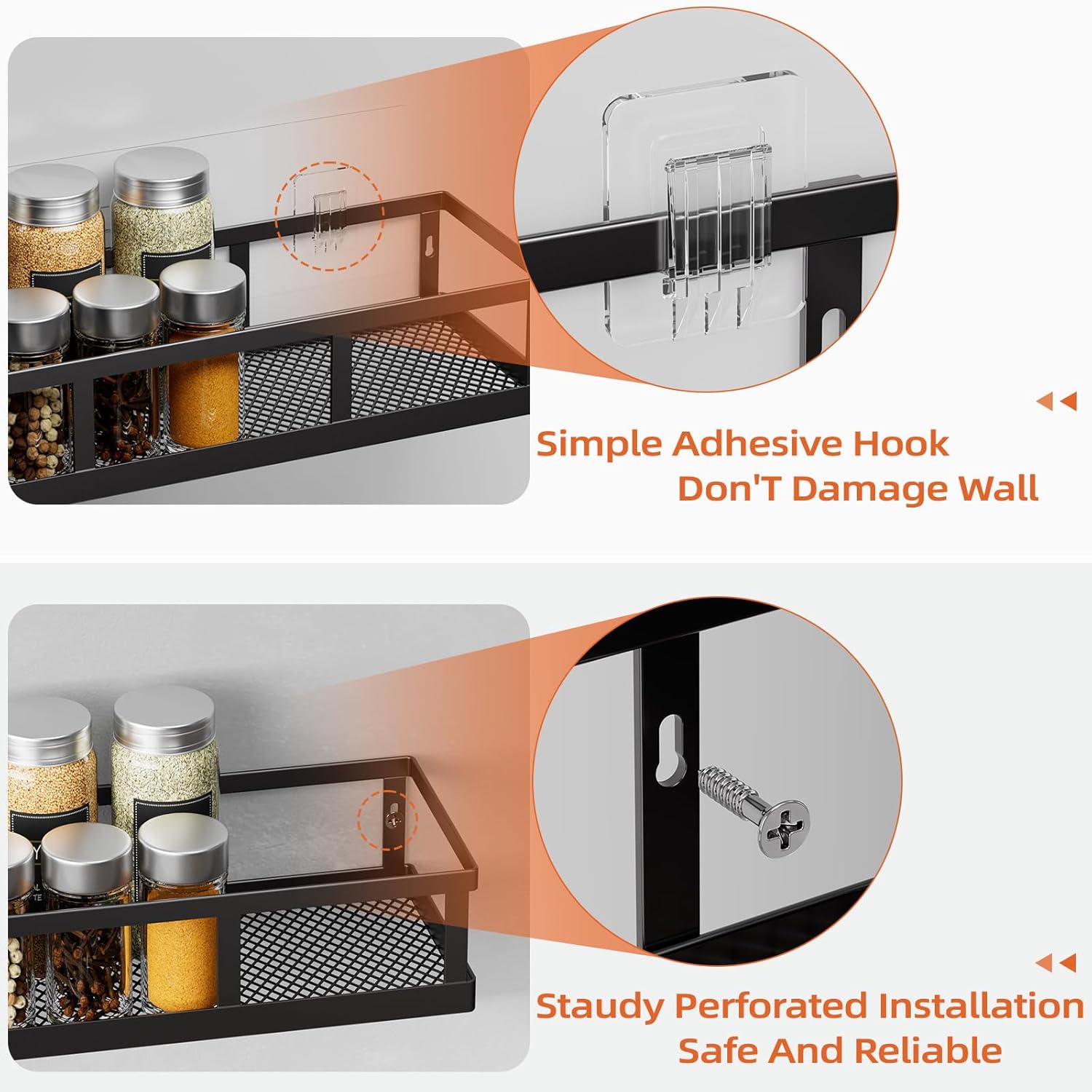 - Premium Metal Material and Stable Storage: The spice rack wall mounted is made of thickened high-strength carbon steel,is waterproof, rustproof, easy to clean.Our spice rack comes with additional 2.76-inch side guards and reinforced adhesive stickers to ensure safety and stability.