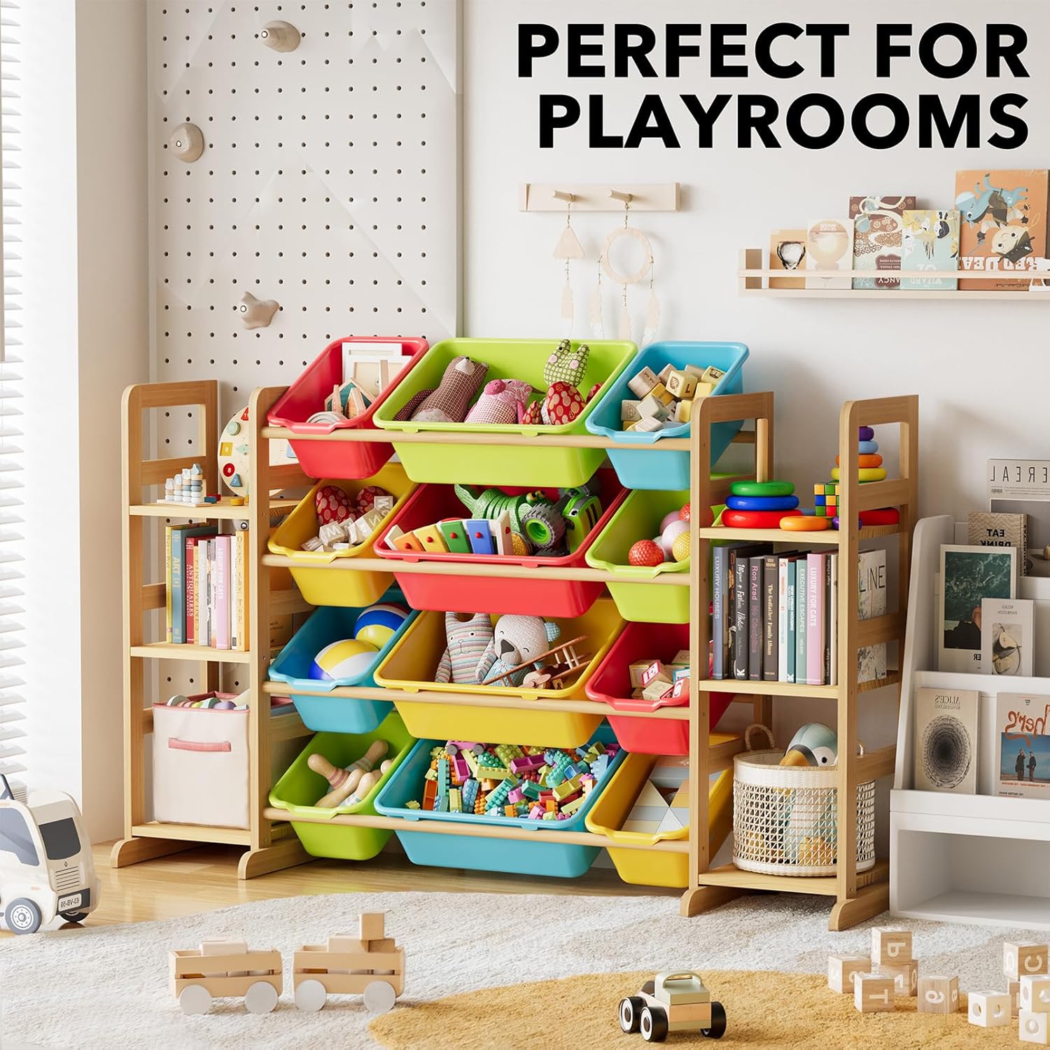 - BEAUTIFUL AND ORGANIZED - Make your kids playroom space neat and organized with this toy storage organizer with bookshelf and 12 multi-colored bins; Shelf Size: 52.3"W x 13.6"D x 31.5"H