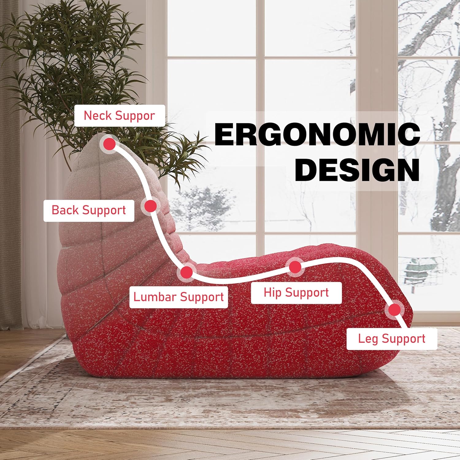 - 【Ergonomic Design】-Designed with your comfort in mind, the bean bag chair features a thoughtful ergonomic design that provides exceptional support for your neck, back, lumbar, hip and leg region. The high-elastic memory foam filling conforms to your body, offering targeted support and ensuring a cozy sitting experience.