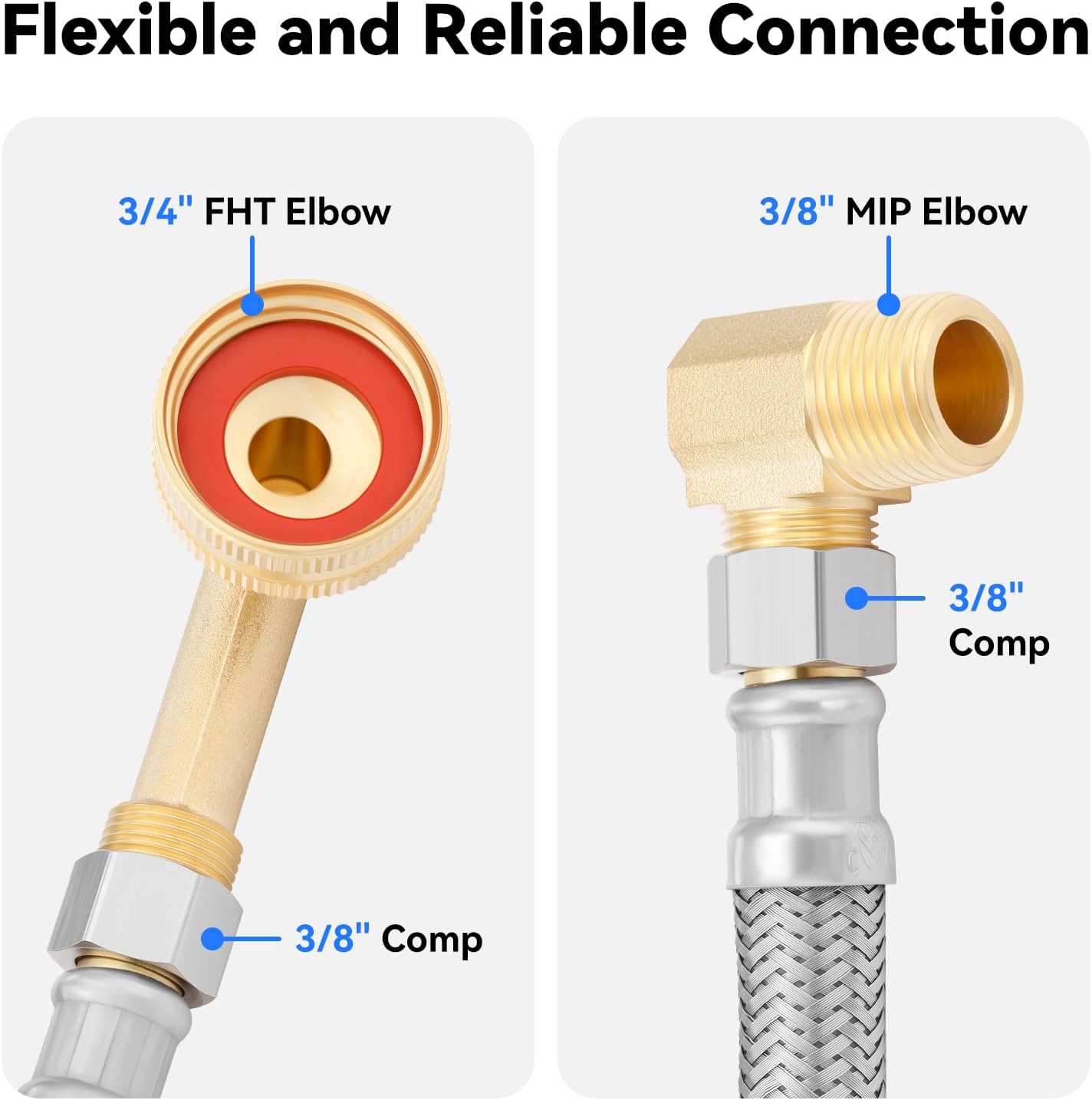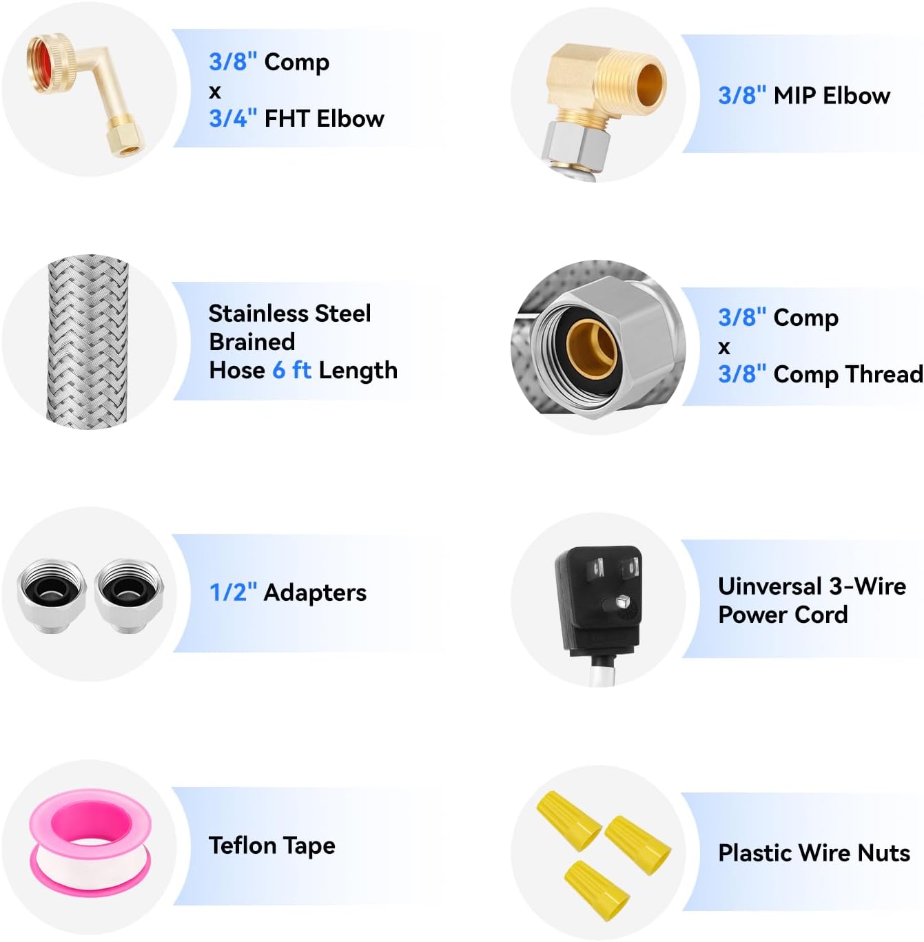 - Complete Installation Bundle: Includes 6ft stainless steel inlet hose, 6ft drain hose (1 pre-bent elbow + trim-to-fit end with clamp), plus adapters, 3-wire power cord, wire nuts, and Teflon tape – all in one kit for full setup.