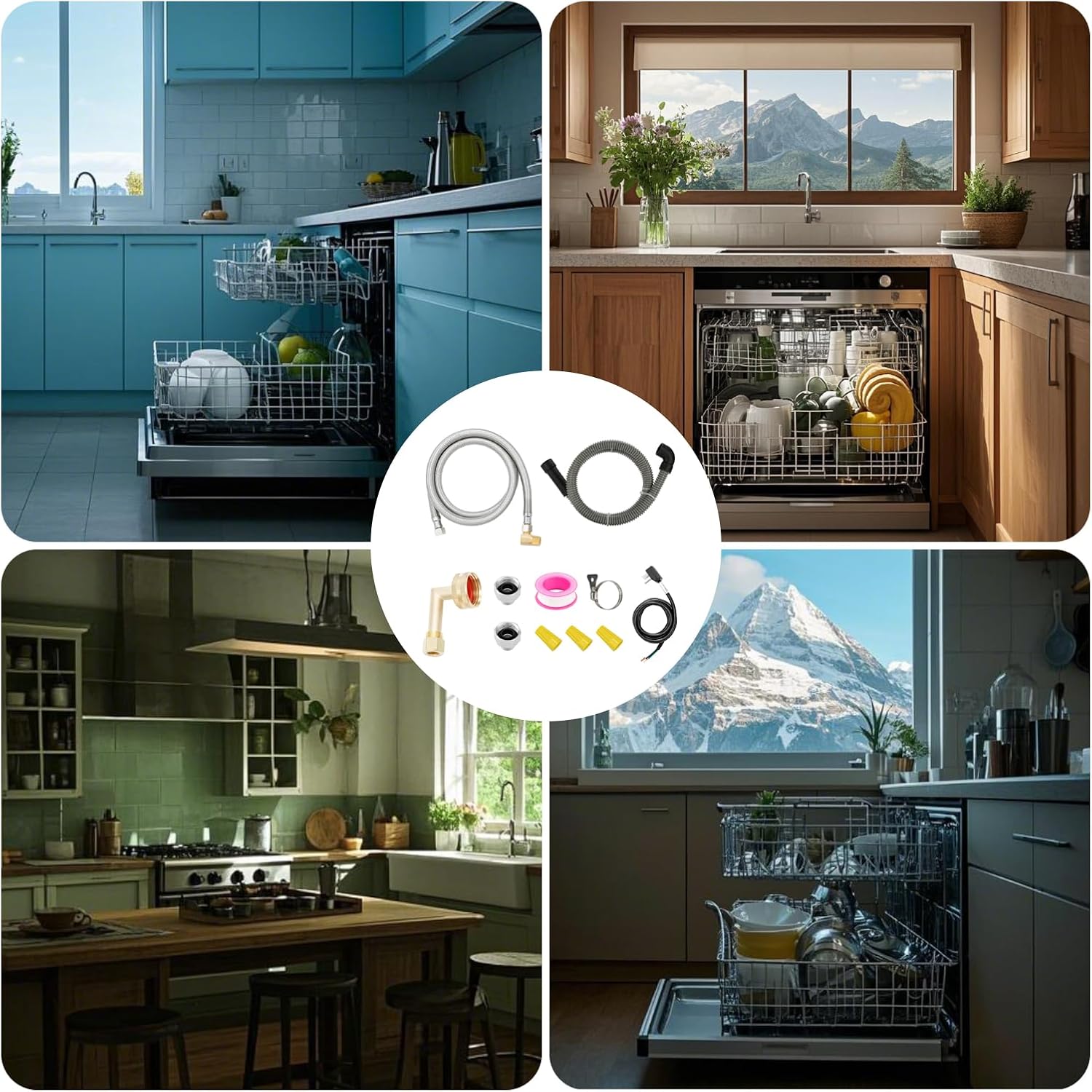 Solimeta Universal Dishwasher Installation Kit – 6ft Stainless Steel Inlet Hose + 6ft Drain Hose with Power Cord & Accessories