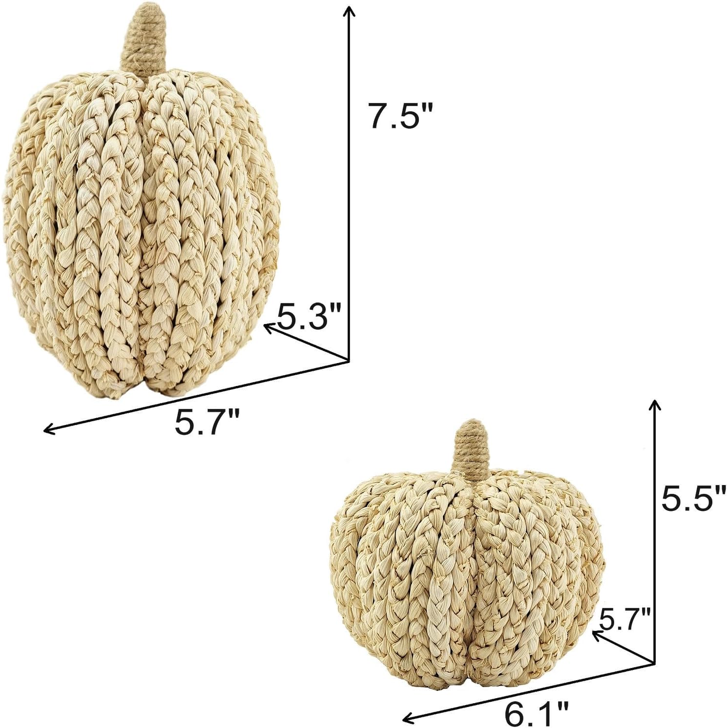 - [Unique Design]This classy thanksgiving decor includes 1 tall pumpkin(5.7*5.3*7.5inches) and 1 short pumpkin(6.1*5.7*5.5inches). Textured woven cornhusk has simple good looking. As fall table decor, they are outstanding and you really want to have them immediately