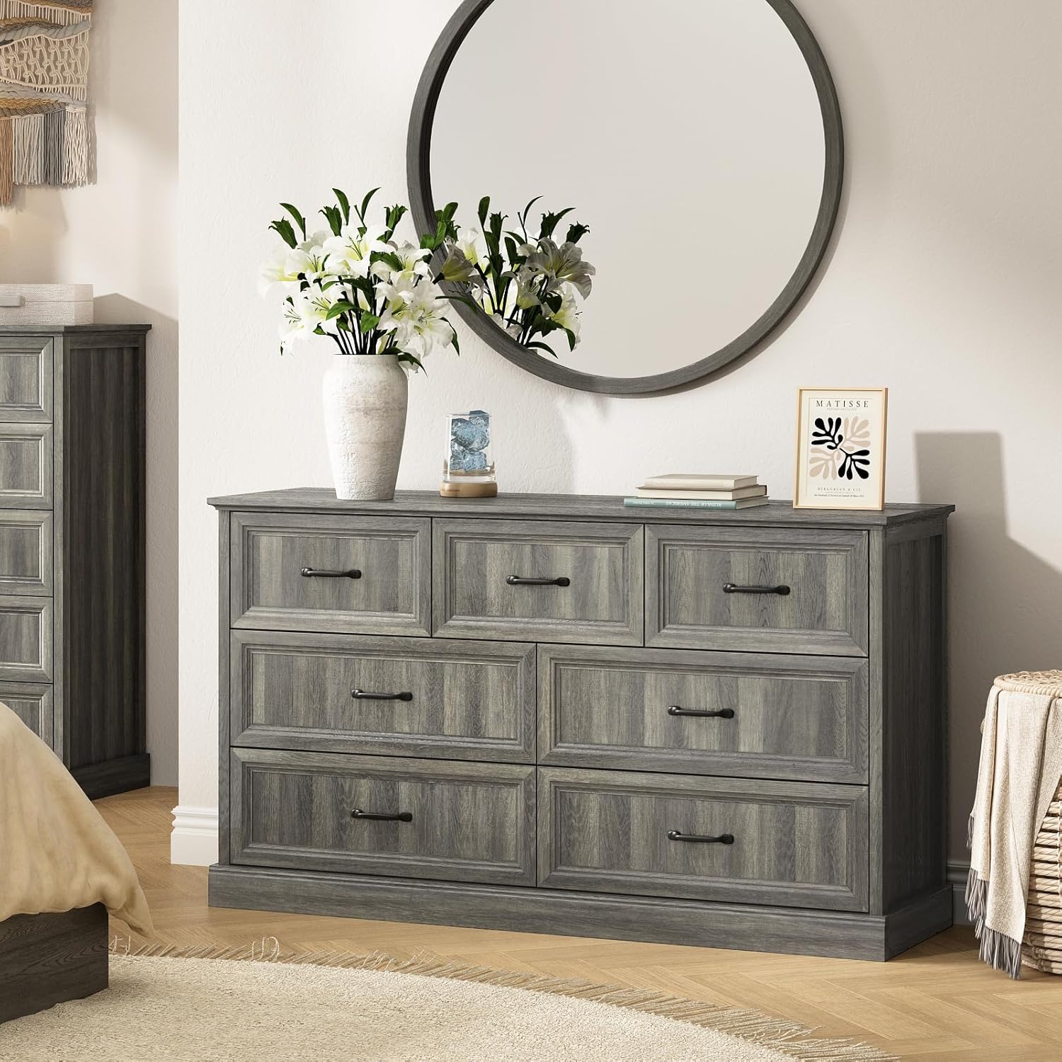 Farmhouse 7 Drawer Dresser for Bedroom, 55 Inch Wide Modern Grey Dresser TV Stand with Large Drawers & Bar Handles, Rustic Wood Chest of Drawers for Bedroom, Living Room, Hallway, Entryway.