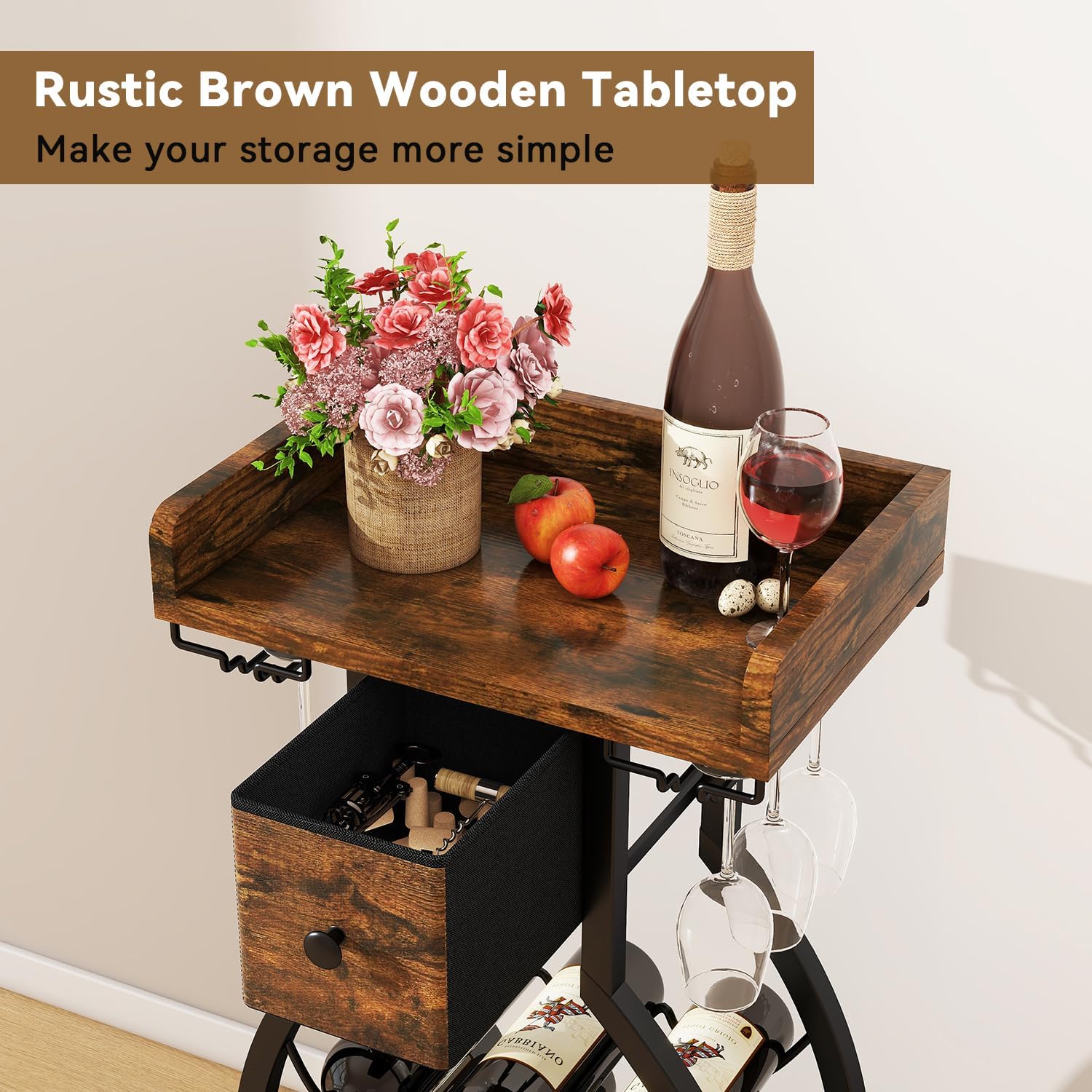 IBUYKE Wine Rack Freestanding Floor,Wine Storage 15 Bottles Bottle Rack with Glass Holders, Mini Bar Wine Cabinet with Storage Drawer for Home Bar Kitchen Dining Room,Rustic Brown,UTMJ908H