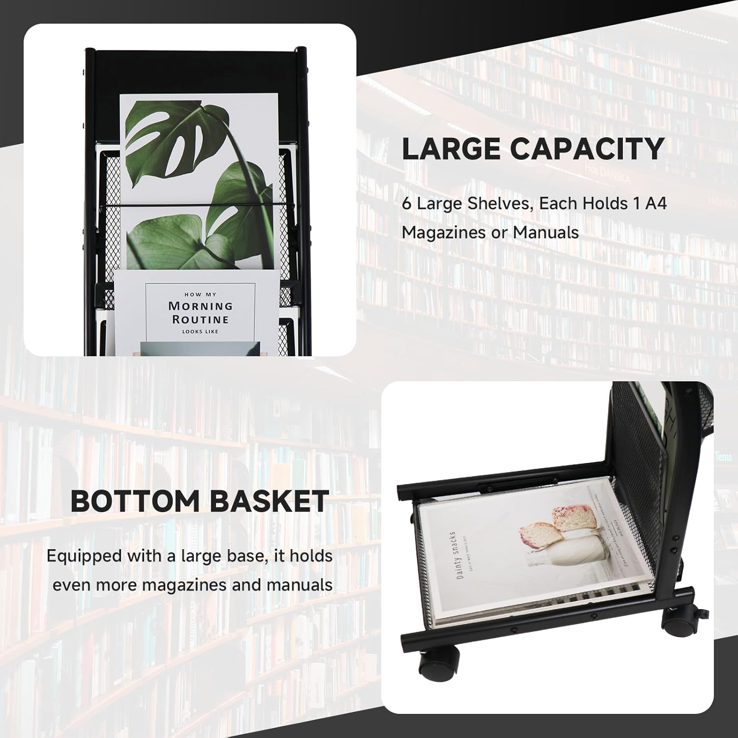 - AMPLE STORAGE SPACE: Our floor-standing magazine rack features 6 spacious shelves, providing ample storage for up to 6 A4-sized magazines placed side by side. Additionally, the bottom basket offers convenient storage for newspapers, brochures, and additional reading materials.