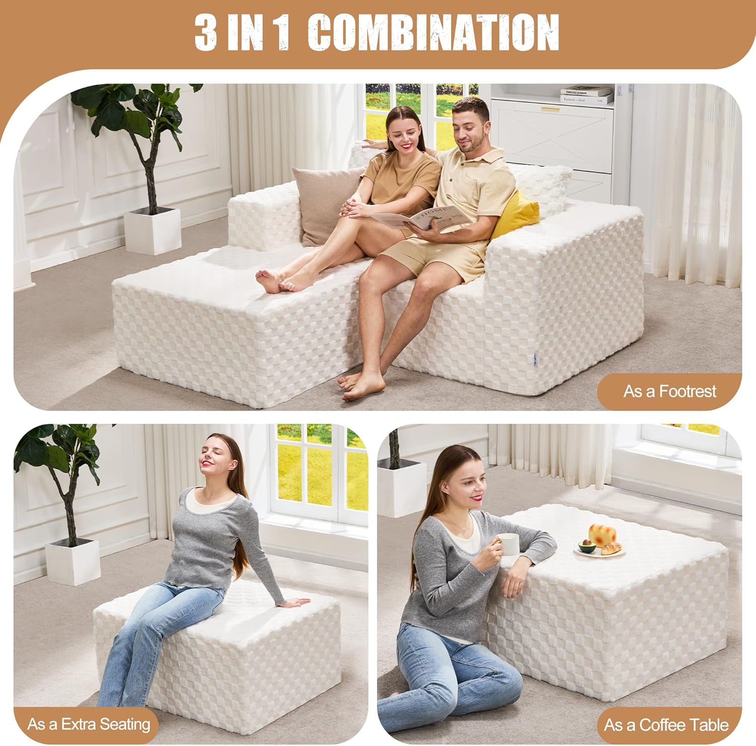 - 3 in 1 Design: The most common use of our ottoman is as a footrest, particularly when paired with a sofa. It provides a comfortable place to rest your feet and elevate your legs while seated. The memory foam ottoman can also serve as an extra seat when needed, accommodating additional guests. What's more, in smaller spaces, the large footrest for couch can double as a coffee table, providing a surface for drinks, snacks, or decorative items.