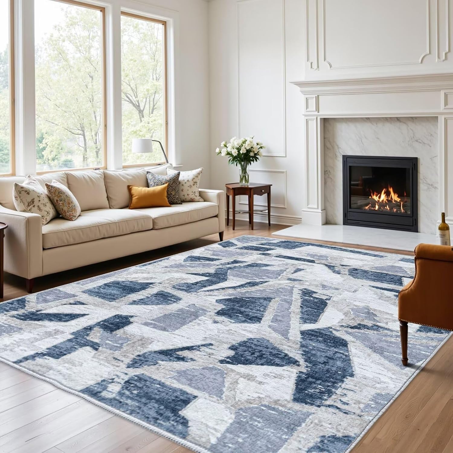 Modern Abstract Blue 8X10 Area Rug for Living Room Bedroom Washable, with Non-Slip Rubber Backing Print Faux Wool Thin, Throw Large Carpet for Kids Playroom Dining Room Pet & Child Friendly