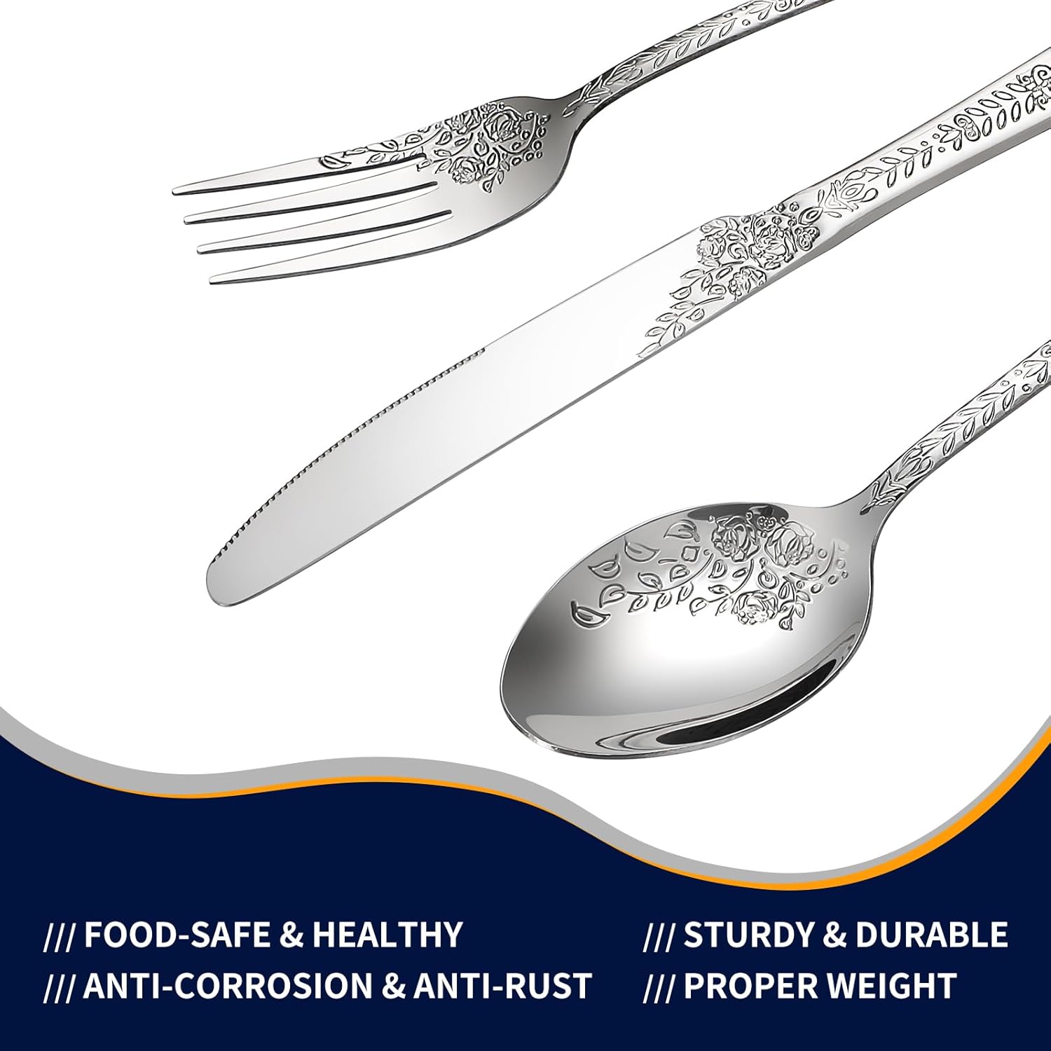 - WONDERFUL WORKMANSHIP AND FUNCTIONAL---Our utensils set is made of multiple mirror polishing treatment, silverware set with floral design Each piece is beautifully adorned with a delicate floral pattern,edge smooth , elegant and classical appearance, adding to the beautiful experience of everyday dining.