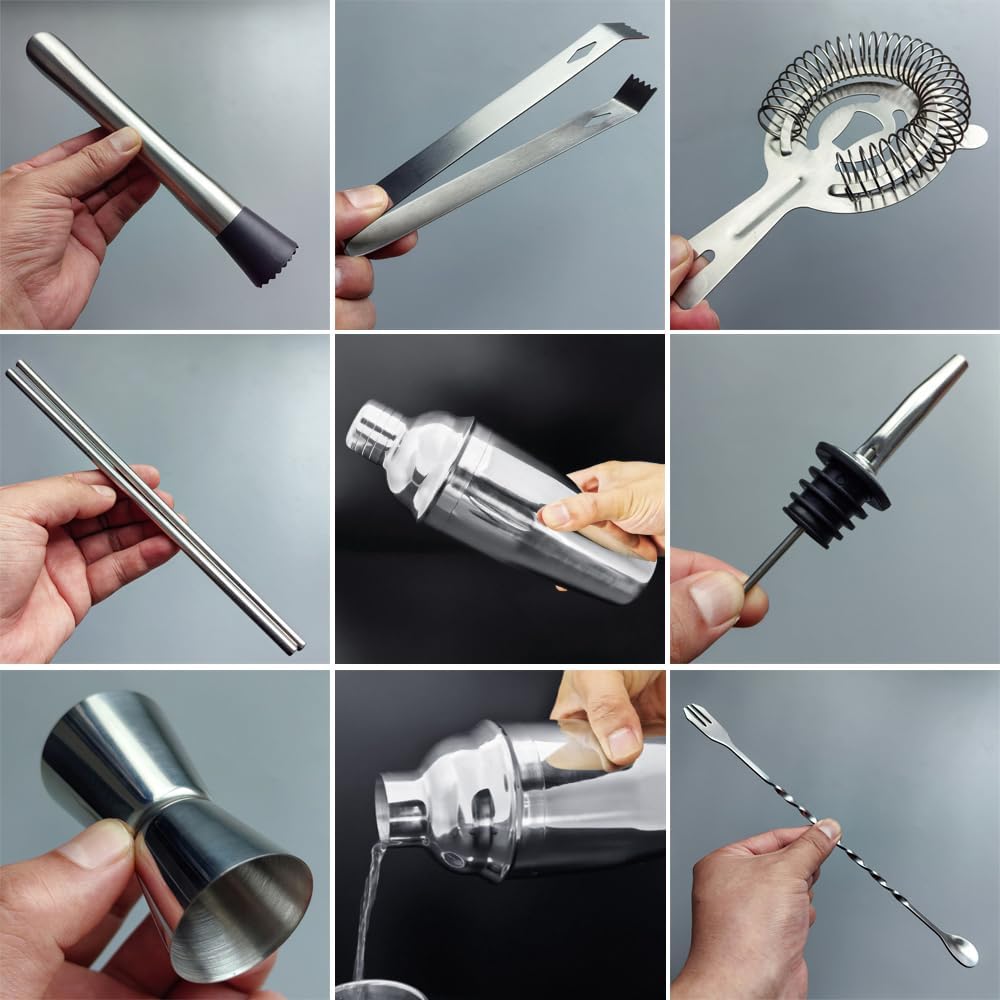 - Bartender Kit included: 1*750ml(25oz) shaker, 1*muddler, 1*15/30ml(0.5/1oz)jigger, 1* ice tongs, 1* ice strainer, 1* fork&spoon, 4 *drinking straw, 4 * Pourer, 1* cocktail Recipes, 1*black stand.