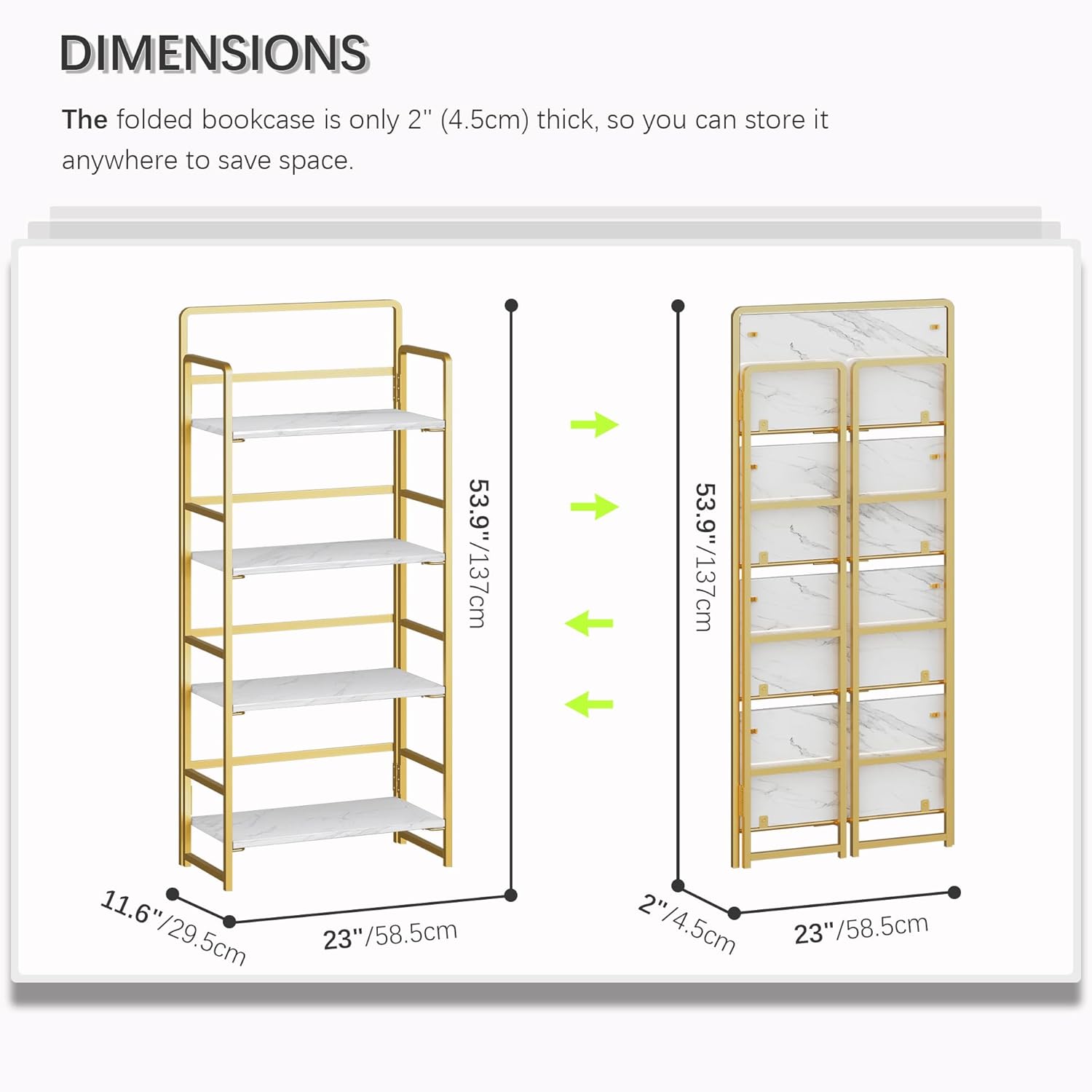 4NM No Assembly Foldable Bookshelf, 4-Shelf Collapsible Bookcase Storage for Small Spaces, 54" H, White and Golden