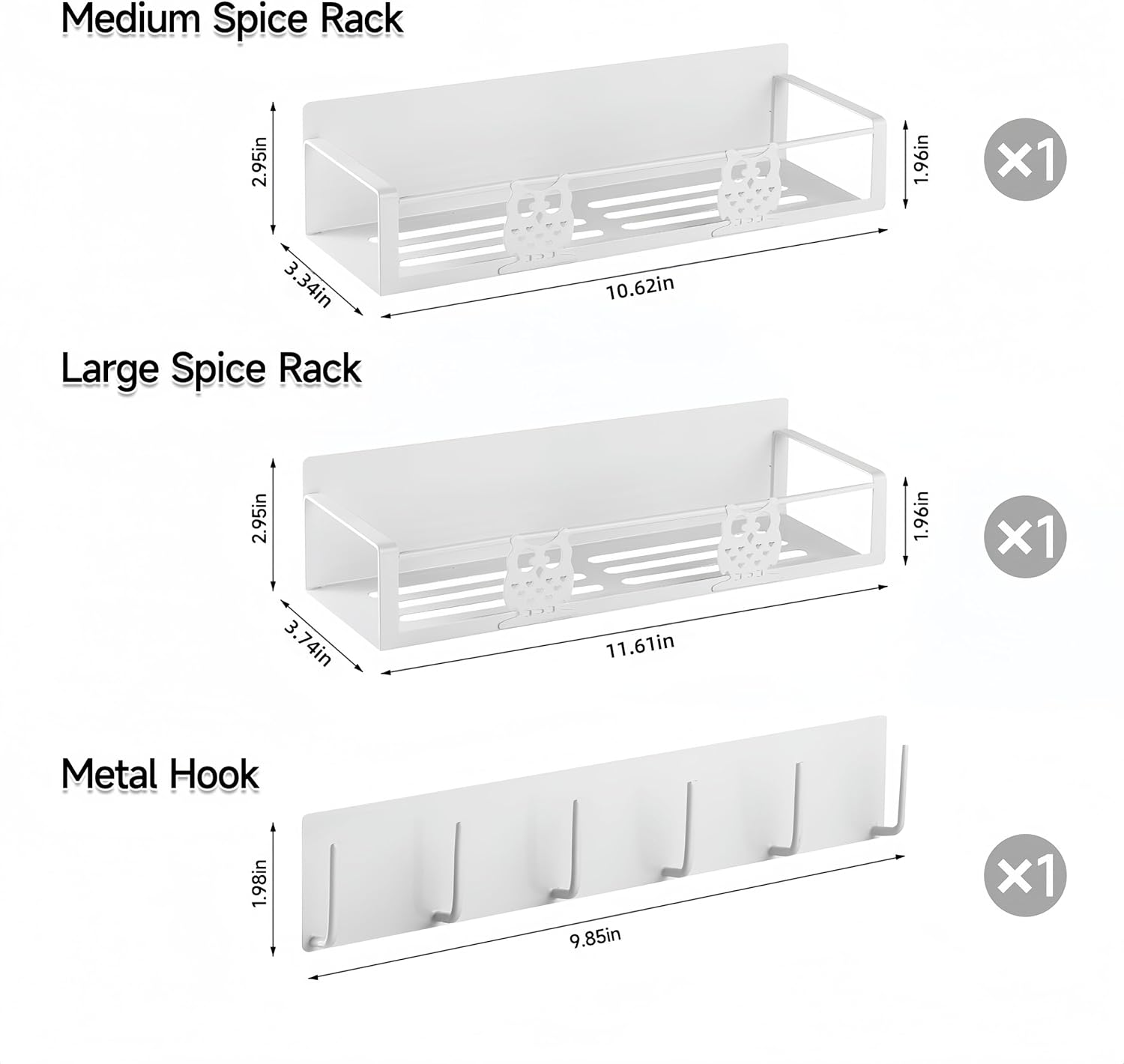 - Perfect Small Space Organization:This magnetic spice rack for refrigerator is the ultimate space-saving solution! Free up your countertops and cabinets while keeping your spices, oils, and kitchen gadgets neatly stored. Designed with 1 separate magnetic hook rack and 2 extra cute magnetic shelves, this organizer is a must-have for home and kitchen