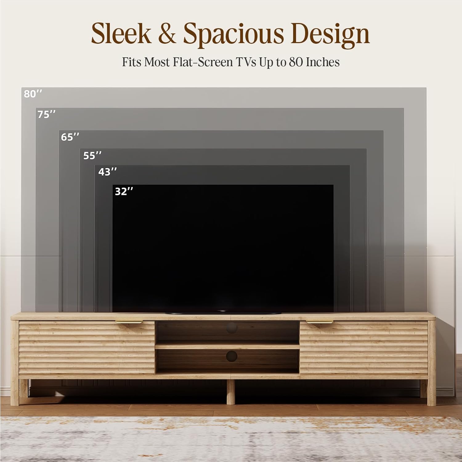- Elevate Your Space: This 70" TV stand blends mid-century modern style with functional design. Features elegant fluted swing doors and curved legs for a sleek look in any living room or bedroom