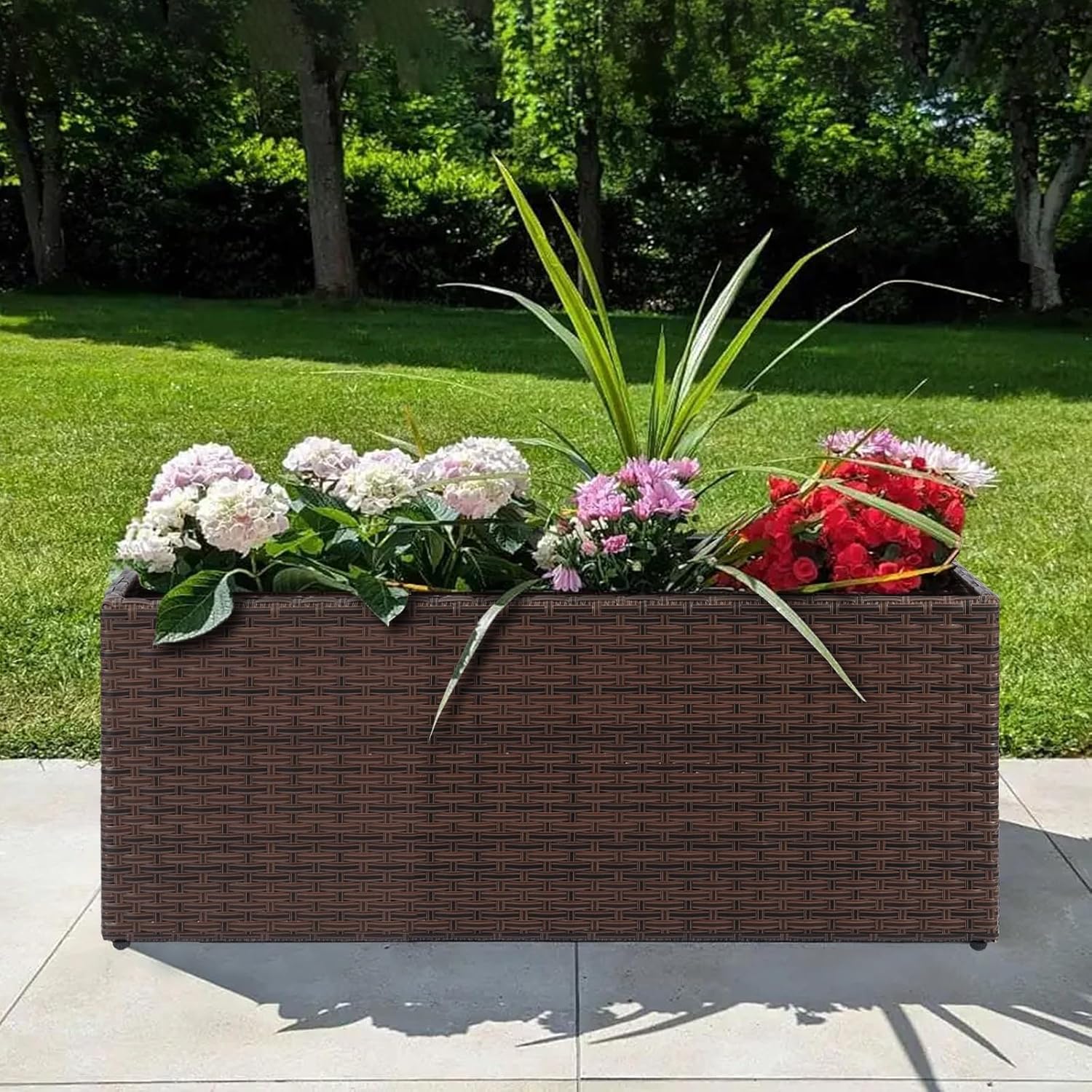 - Long-lasting Construction: Our modern tall and long planter crafted from high-quality metal with the charm of handwoven PE rattan ,PE rattan is a very stable, evenly wound plastic fiber that was specially developed for garden furniture. These planters are lightweight yet sturdy ,the flower pot is weatherproof, UV light resistant, dirt-repellent and easy to clean, With our planters give your outdoor area an elegant flair. The timeless design plannter goes well with almost any furnishing style and with many types of plants