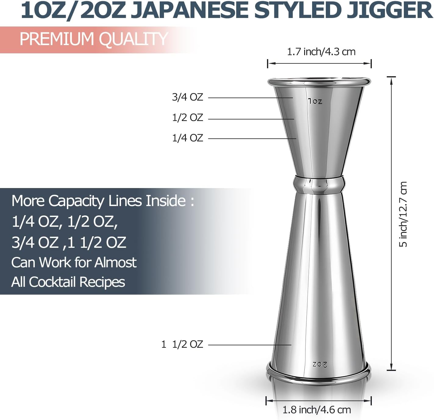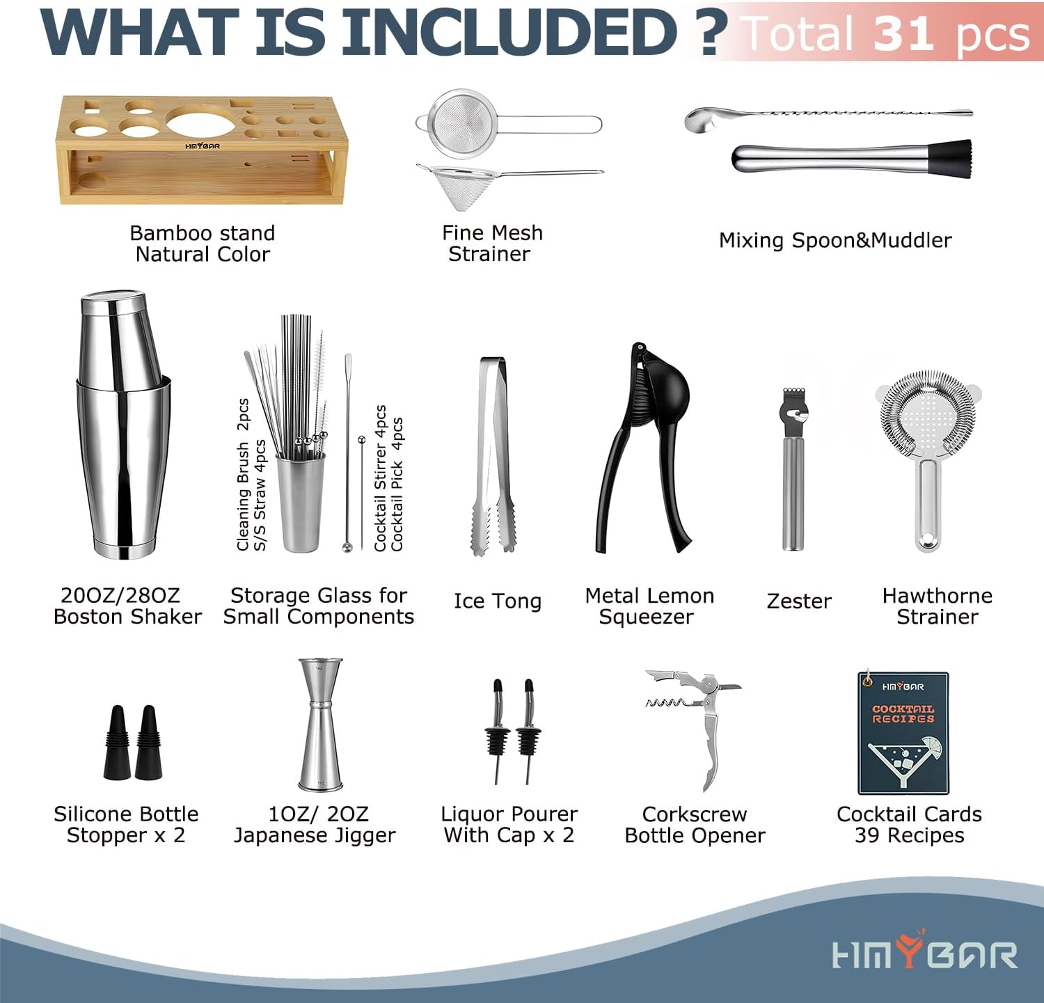 - Included Components : 20/28OZ Boston Shaker, Double-Side Jigger (30ml/60ml), Mixing Spoon (25cm Length), Hawthorne Strainer, Fine Mesh Strainer, Liquid Pourer with Cap, Muddler, Corkscrew, Bottle Stopper, Ice Tong, Zester, Lemon Squeezer, Stainless Straw, Cocktail Pick, Cocktail Stirrer, Brush for Cleaning Straw/Pourer, Storage Glass, 39-Recipe Cocktail Cards, Bamboo Stand. 20/28OZ Boston Shaker, Double-Side Jigger (30ml/60ml), Mixing Spoon (25cm Length), Hawthorne Strainer, Fine Mesh Strainer, Liquid… See more