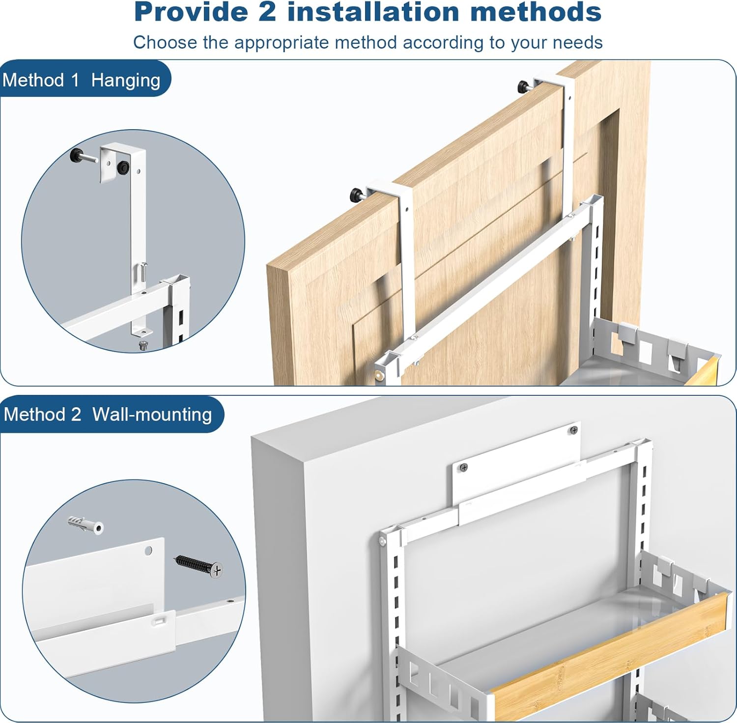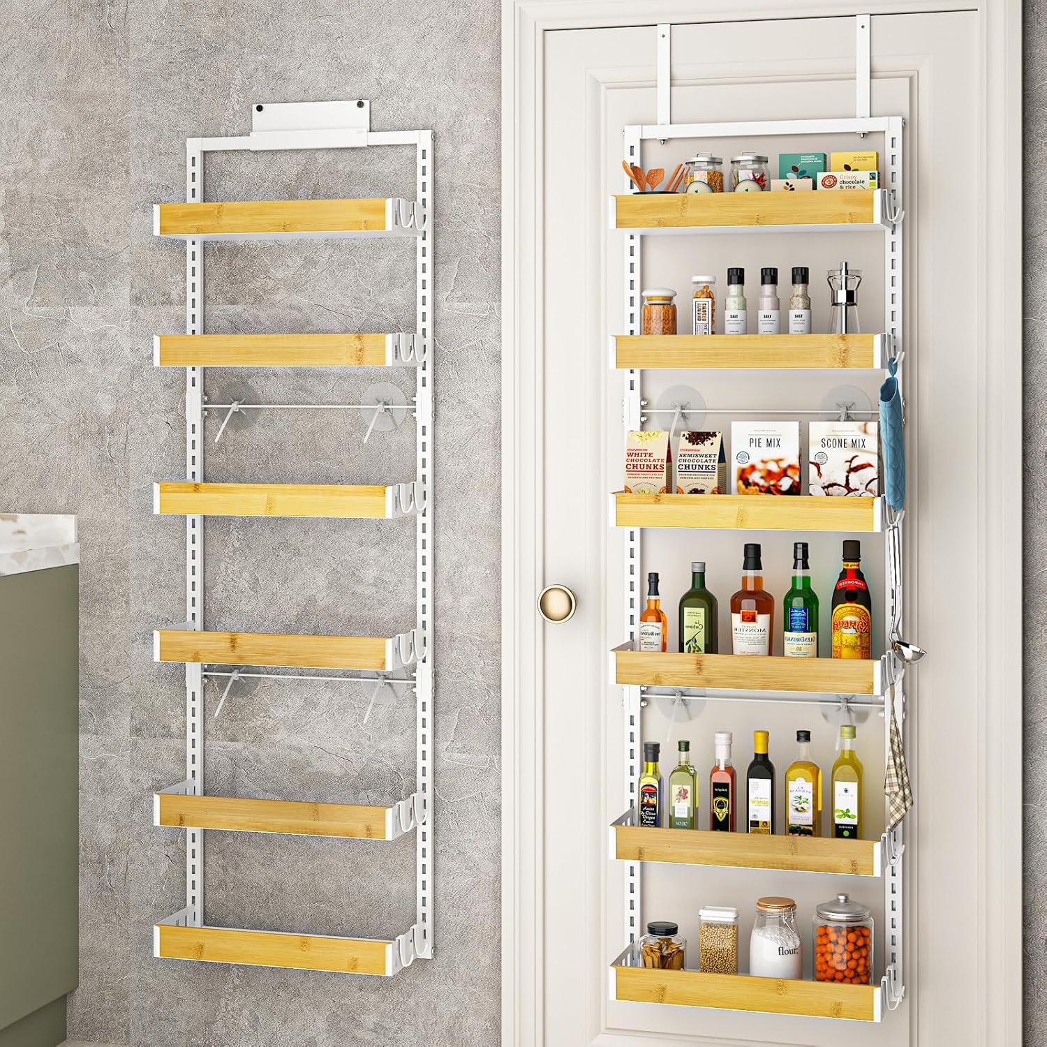 bukfen Over the Door Pantry Organizer 6-Tier Adjustable Basket Kitchen Pantry Door Organization and Storage, 2 in 1 Wall Mount or Hanging Heavy-Duty Metal Hanging Kitchen Spice Rack,White Bamboo Color
