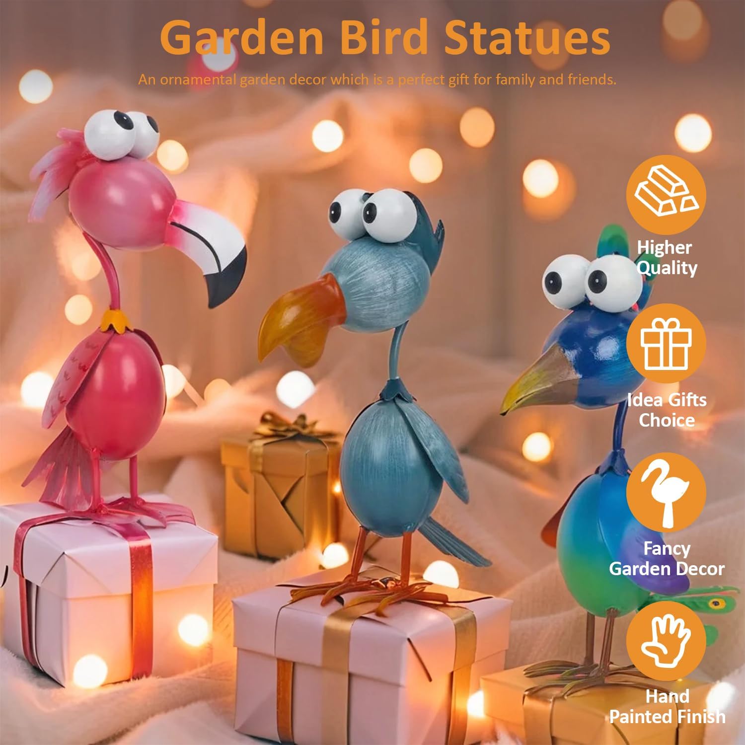 Kircust Outdoor Metal Bird Yard, Garden Decor for Outside Flamingo/Peacock/Pelican Decorations Art Statues, Lawn Ornaments for Courtyard, Patio, Backyard, Porch, Set of 3