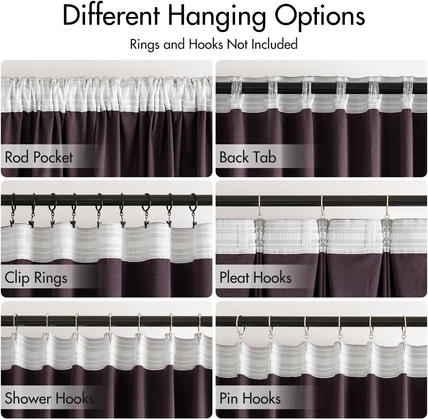 - HANGING OPTIONS: Each curtain panel has 3-in-1 top style design: rod pocket, back tab and pinch pleat. Back loop (2.3 inch) and rod pocket (3.1 inch) fit most standard rod. Curtains also can be hung with clip rings or curtain hooks. 3 ways to meet your various needs.