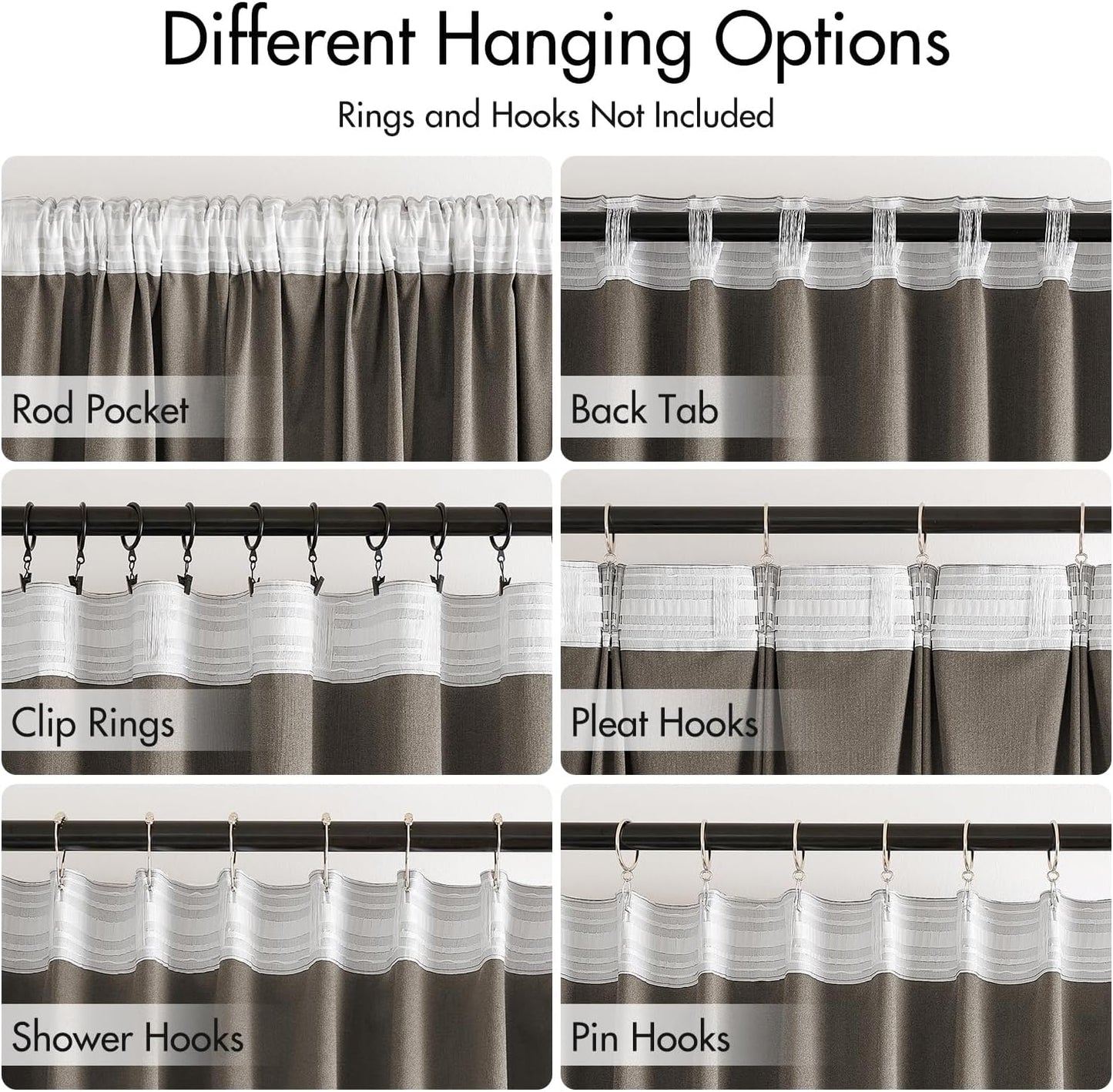 - HANGING OPTIONS: Each curtain panel has 3-in-1 top style design: rod pocket, back tab and pinch pleat. Back loop (2.3 inch) and rod pocket (3.1 inch) fit most standard rod. Curtains also can be hung with clip rings or curtain hooks. 3 ways to meet your various needs.