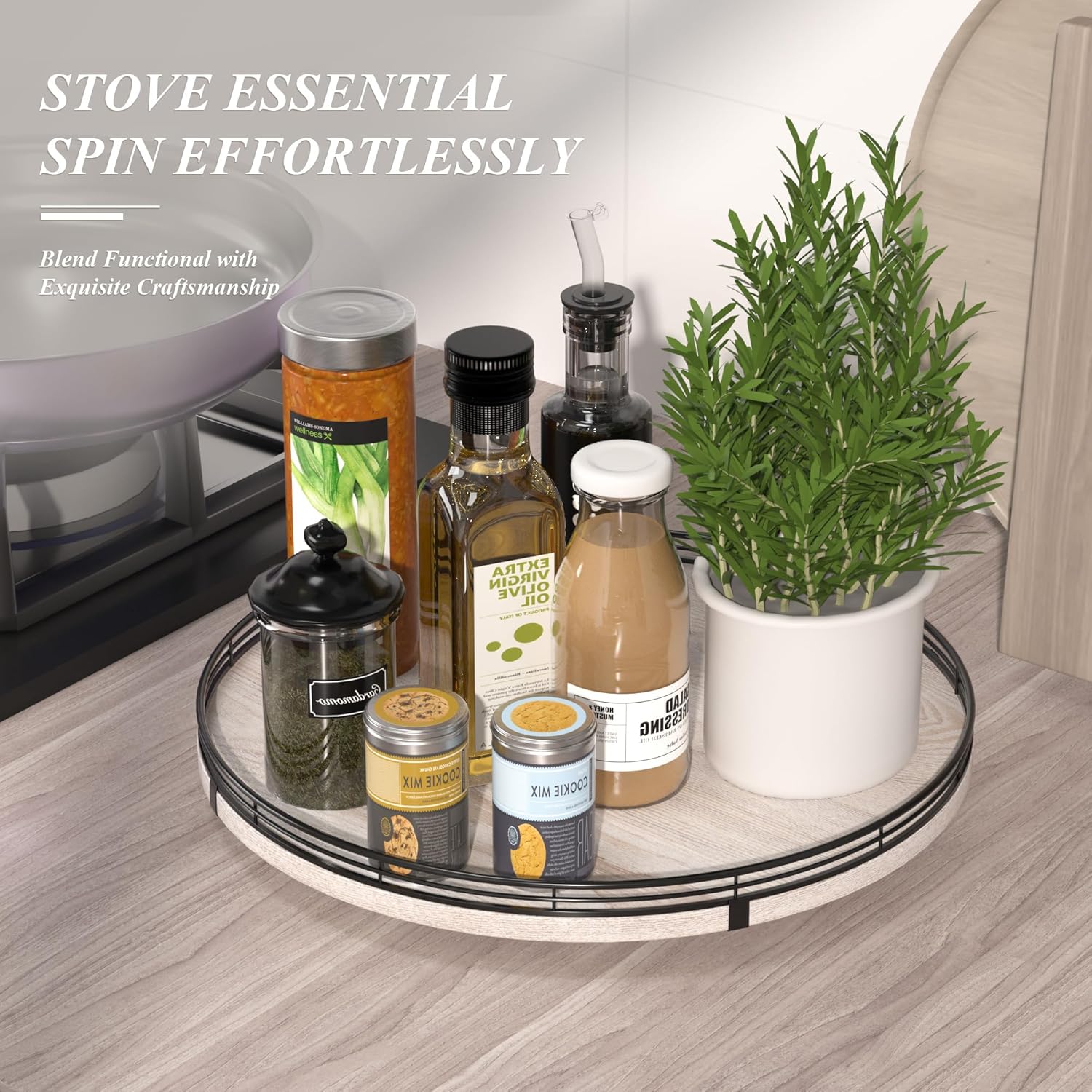 - PREMIUM MATERIAL: Our farmhouse lazy Susan organizer is made of natural wood and strong Iron, sturdy, durable and premium quality. This wooden turntable organizer is a game-changer for keeping your kitchen organized. The farmhouse finish gives it a rustic, charming look that will fit perfectly with your kitchen decor.