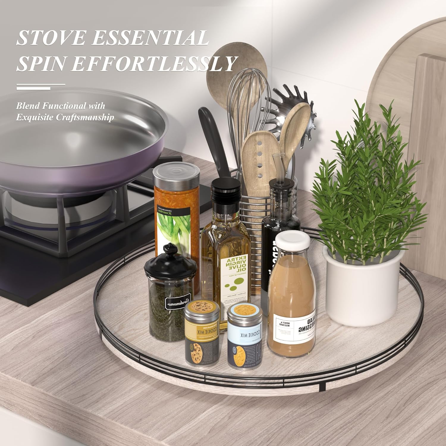 - PREMIUM MATERIAL: Our farmhouse large lazy Susan organizer is made of natural wood and strong Iron, sturdy, durable and premium quality. This wooden turntable organizer is a game-changer for keeping your kitchen organized. The farmhouse finish gives it a rustic, charming look that will fit perfectly with your kitchen decor.