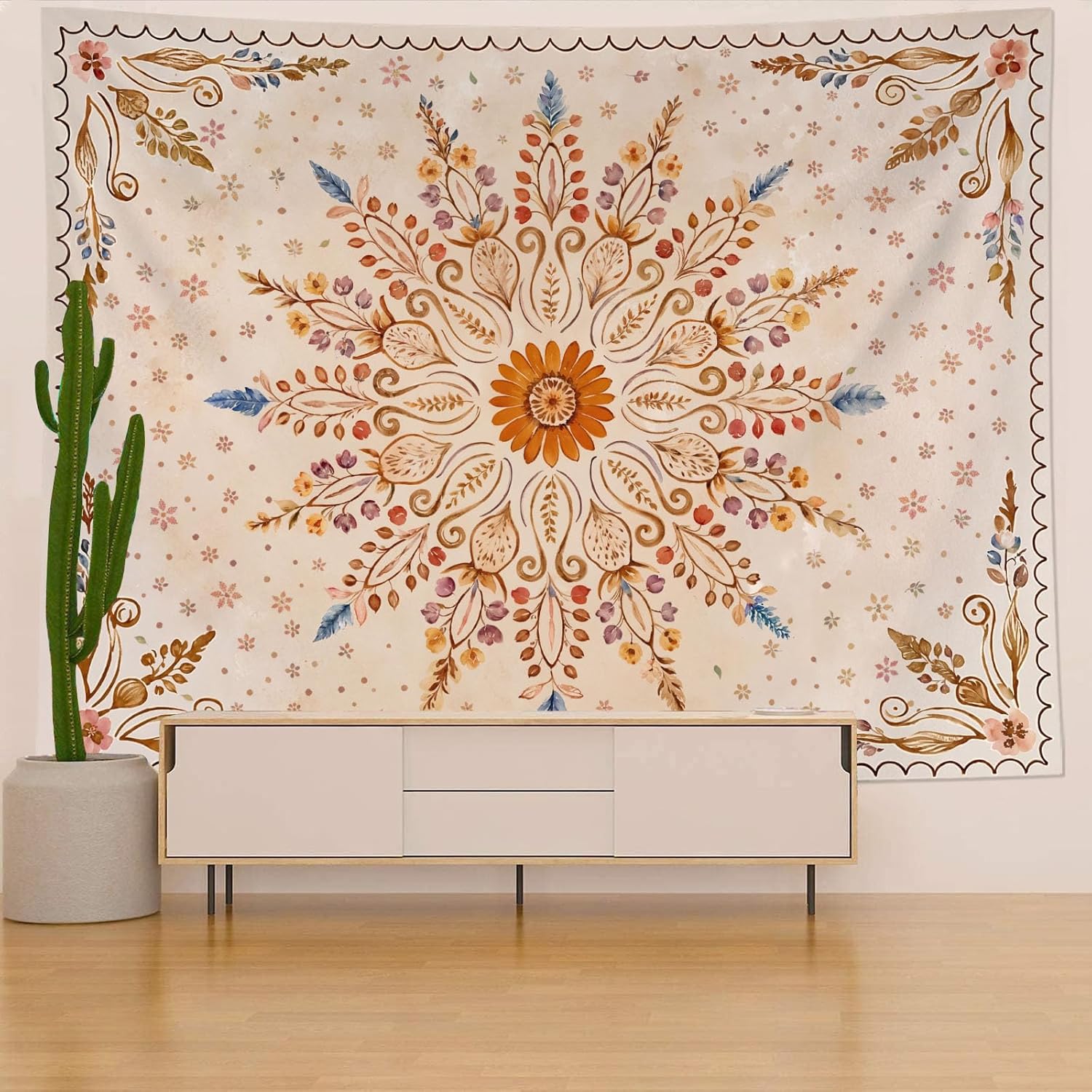 - Intricate Mandala Design: This boho tapestry for bedroom features a beautiful mandala and floral pattern that blends bohemian and modern aesthetics, making it an eye-catching piece of art for your wall
