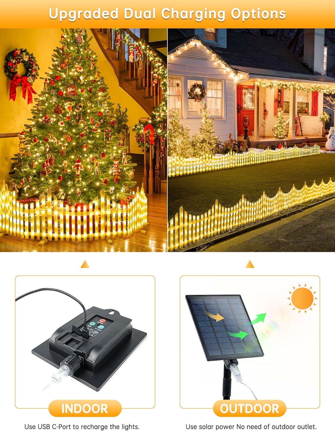 - 8 Lighting Modes:The Christmas tree fence solar lights can switch fantastic 8 lighting modes(combination,in wave,sequential,slo glo,chasing/flash,slow fade,twinkle/flash,and steady on) by the remote or the back of solar panel