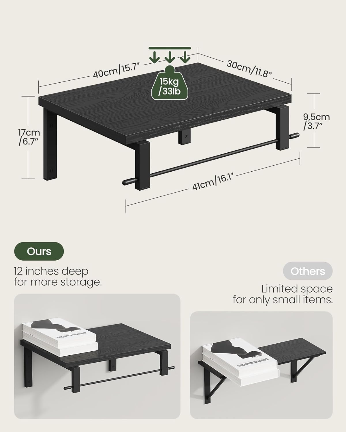 - Sturdy and Enduring: The wall shelf set is made of thick, widened particleboard that can withstand wear and tear and are easy to clean. Paired with a robust metal frame and extended screws for secure wall mounting, each shelf holds up to 33 pounds