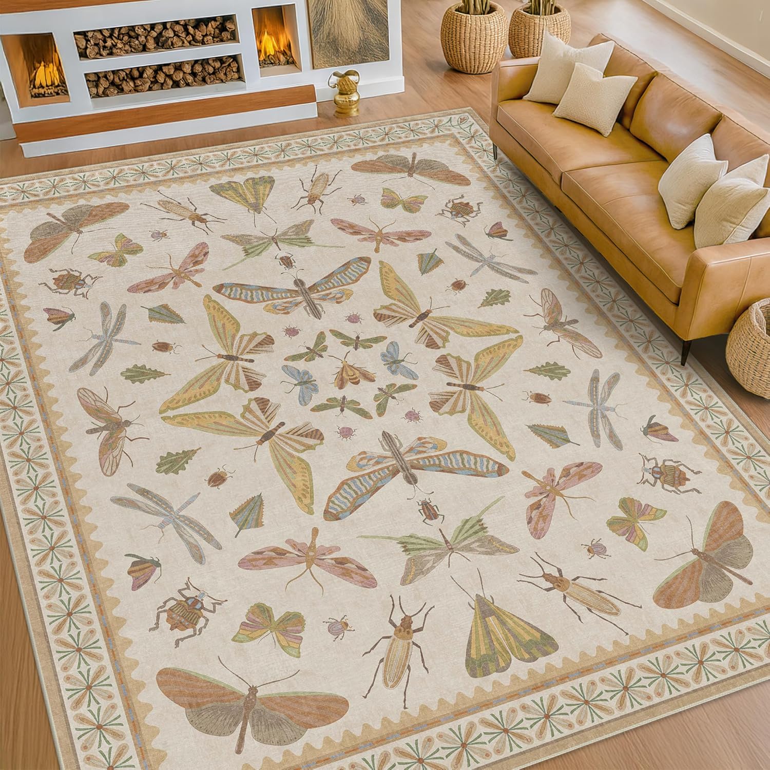 - Whimsical Nature-Inspired Design: Celebrate the wonder of the natural world with this charming insect-themed washable area rug. A neutral beige background provides a soft canvas for an intricate array of butterflies, dragonflies, beetles, and moths—arranged in playful symmetry. The muted tones of sage green, golden mustard, dusty blue, and blush rose lend a vintage botanical feel, while the hand-illustrated look evokes the feel of antique, cottagecore, eclectic entomology prints