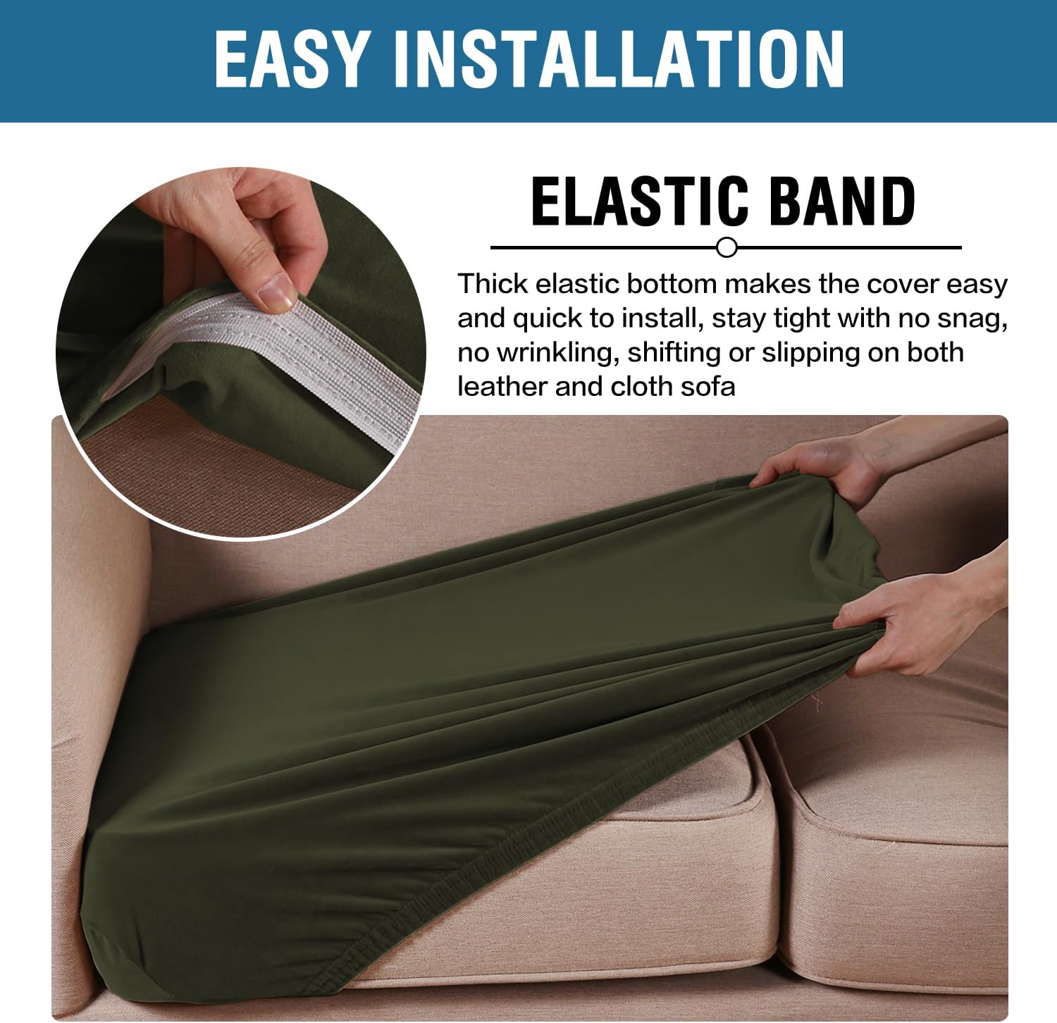 - STAY IN PLACE: Featuring non-skid thick elastic bottom, our cushion slipcover can stay tight with no snag, no wrinkling, shifting or slipping on both leather and cloth sofa. Check the installation guide carefully, it can be finished within 3 minutes by one person. It is very easy to put on and take down. (Installation Instructions Included)