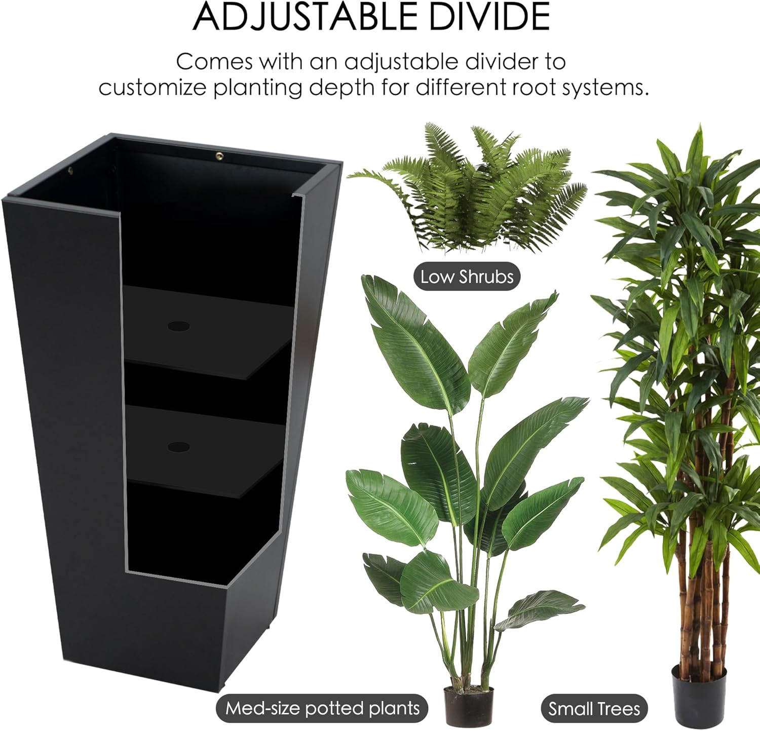 - Partition Panel Design: Steel flower pot featuring two adjustable removable internal partition panel, easily adapts to your plants’ root depth—from low shrubs to small trees. Customize the interior height during assembly for a truly tailored gardening experience, layer design for versatile planting.
