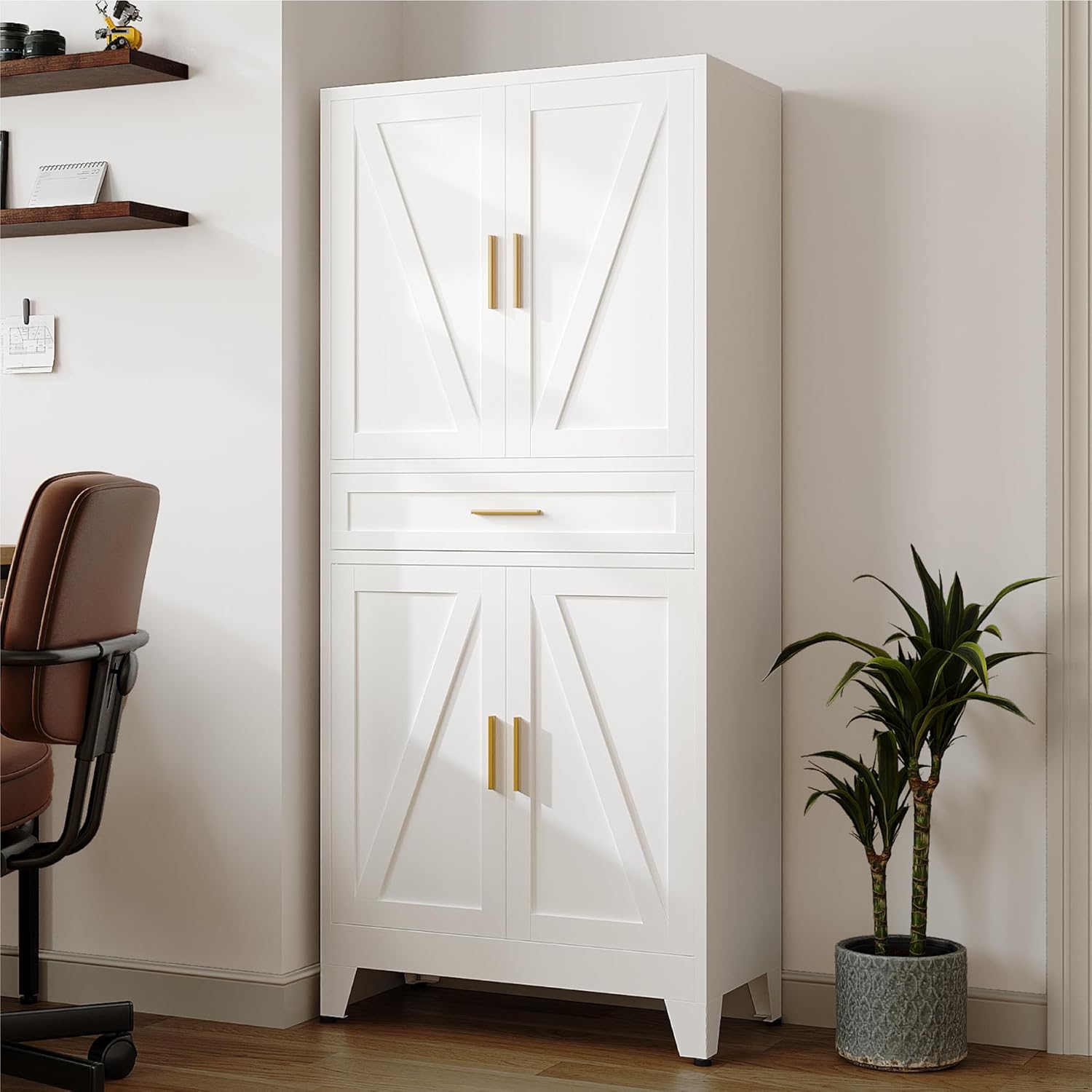 71 "Farmhouse Metal Filing Cabinet with a Drawer and 4 Adjustable Shelves, with 4 Large barn Door White Kitchen Cabinets, Metal Food Cabinets for Home, Kitchen, Dining/Living Room (White)