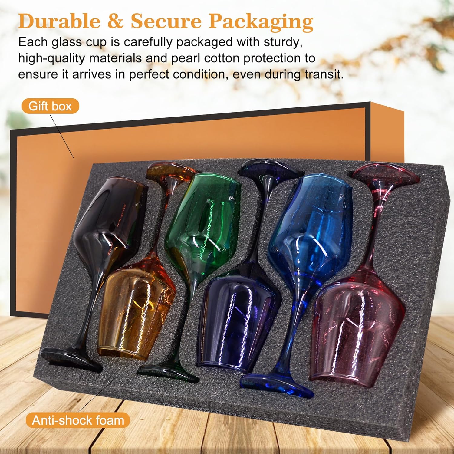 - 【Elegant and Secure Packaging】Glazvia unique wine glasses is carefully packaged in an elegant and durable box to ensure safe delivery. The sturdy packaging protects the colorful glasses drinkware during shipping, so you can be confident they will arrive in perfect condition. Whether purchasing for personal use or as a wine glasses gift set, this thoughtful packaging adds an extra touch of sophistication, making the unique wine glasses set of 6 as an wine glass gifts for women.