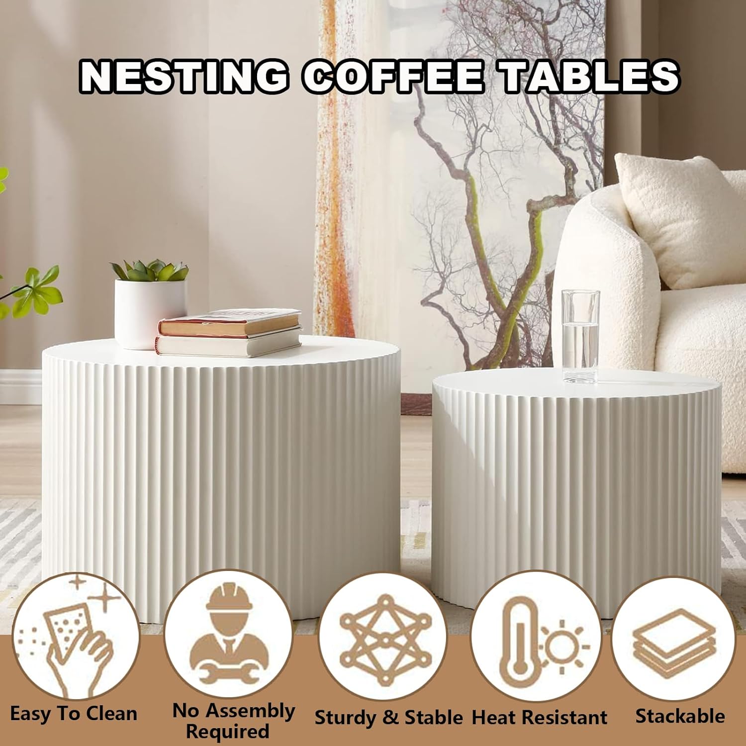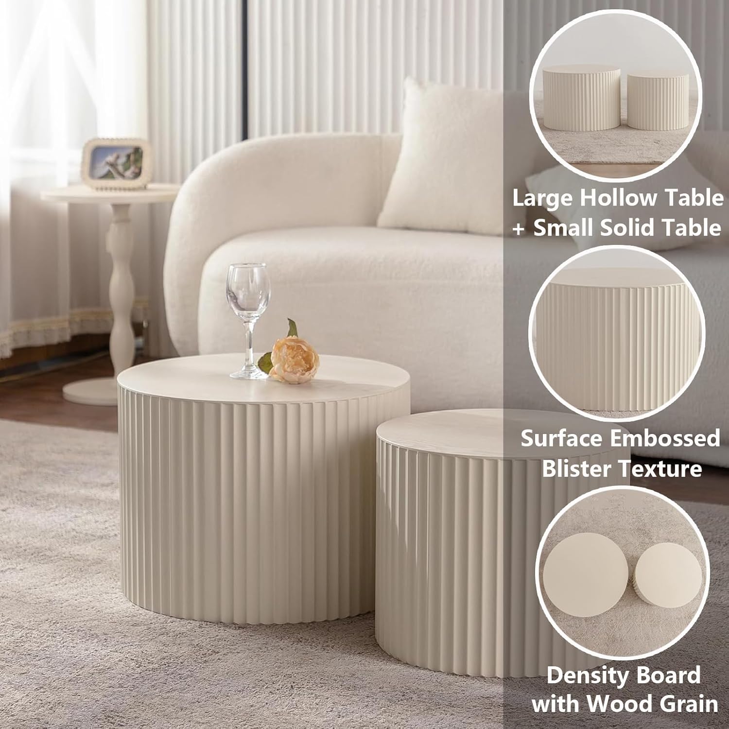 Round Nesting Coffee Table Set of 2, Modern Coffee and End Table Set Small Circle Wooden Drum Side Table Accent End Tables for Living Room Office, No Assembly,Cream Small